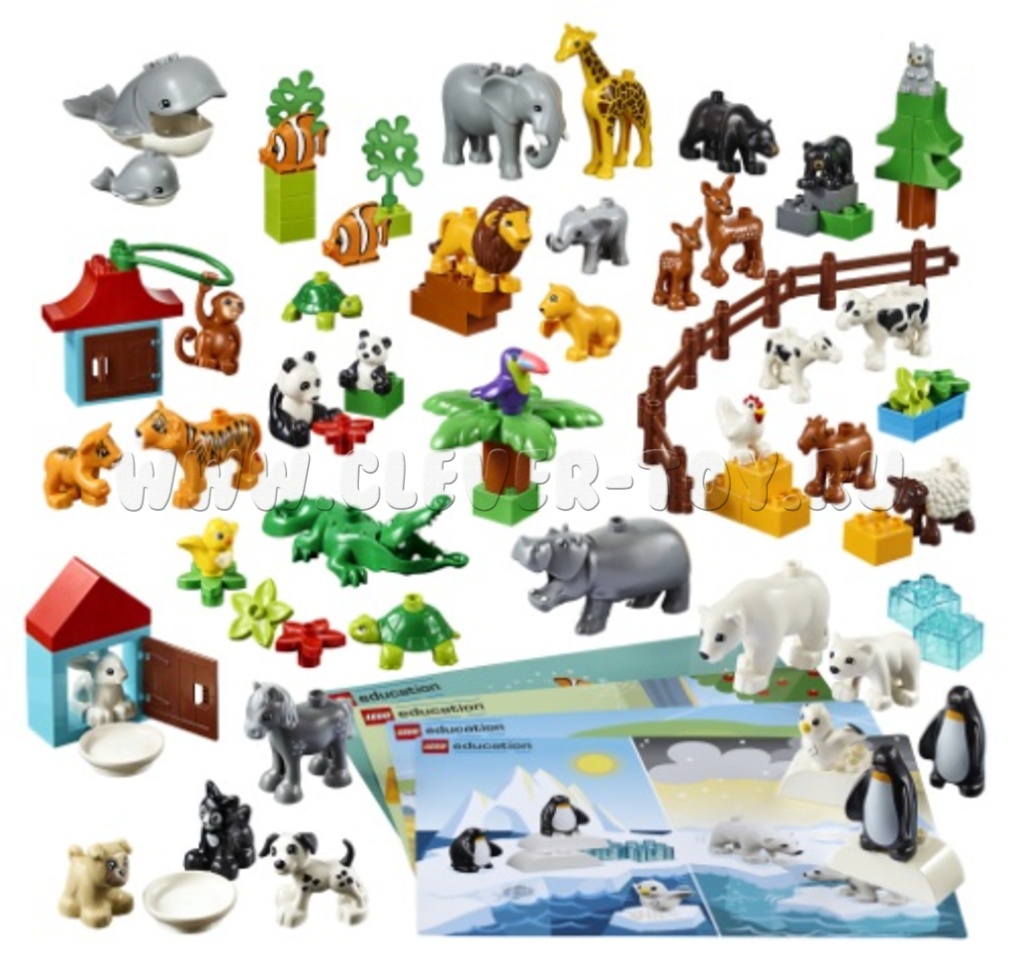 Набор "LEGO Animals". В комплекте большое количество фигурок животных и куча доплнительных деталей (будки, ограда, деревья, льдины, еда и мн. др.), карточки с заданиями.