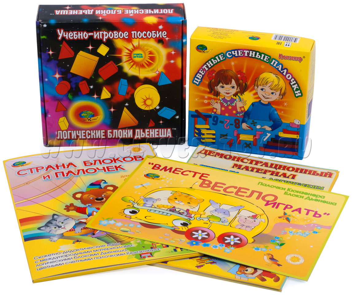 Данный комплект сформирован для детей возрастной группы 2-7 лет и включает в себя и палочки Кюизенера, и блоки Дьенеша, а также совмещенные наборы заданий для них.