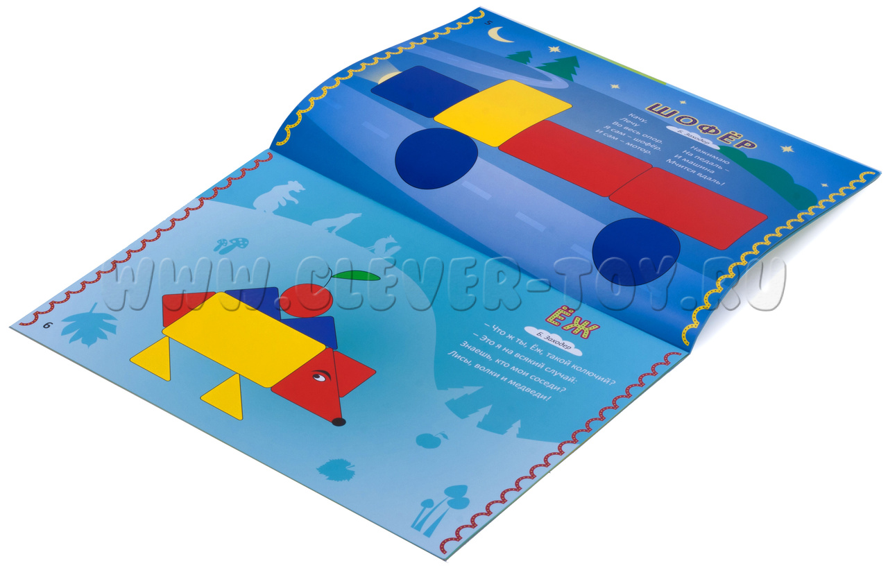Их иллюстрируют изображения машин и животных в виде геометрических фигур разного размера и цвета.