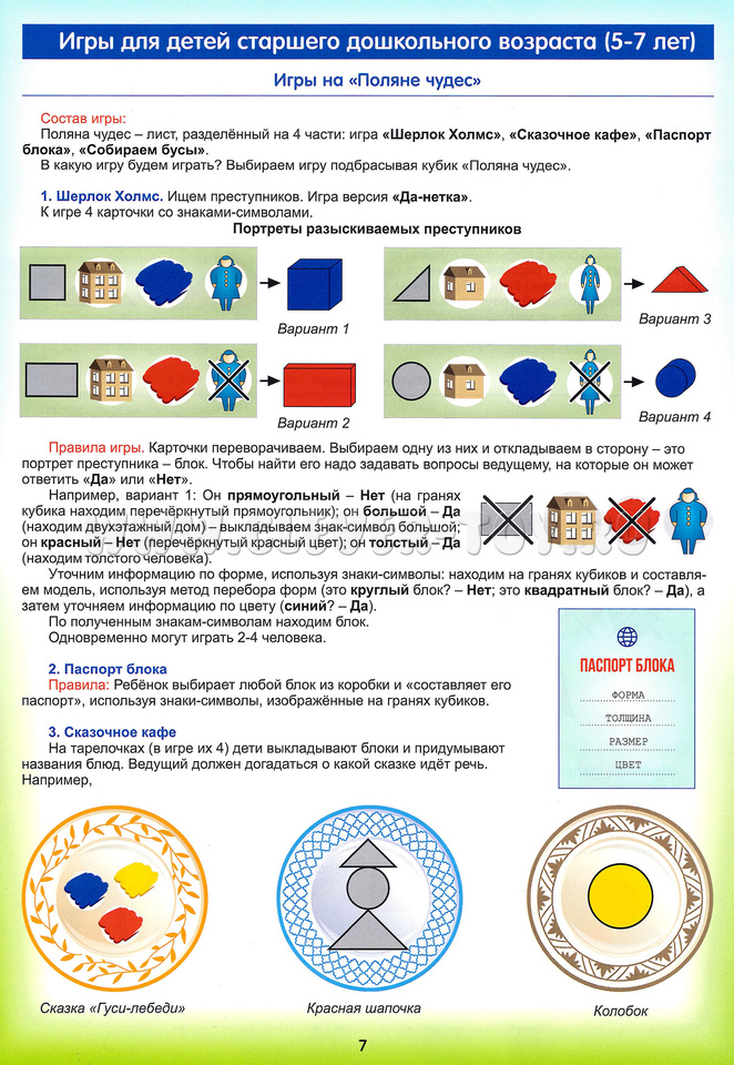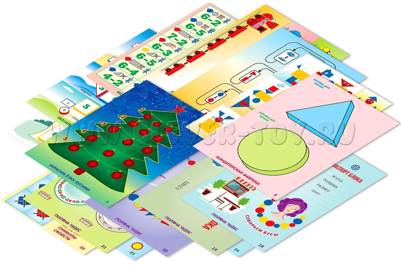 - Игры для детей дошкольного возраста (5-7 лет): «Магазин», «Украсим ёлку бусами», «Архитекторы», «Логический поезд», «Мозаика цифр», «На поляне Чудес» (Шерлок Холмс, Сказочное кафе, Паспорт блока, Собираем бусы), Карточки-символы свойств, Дорисуй картину, Кубики.
