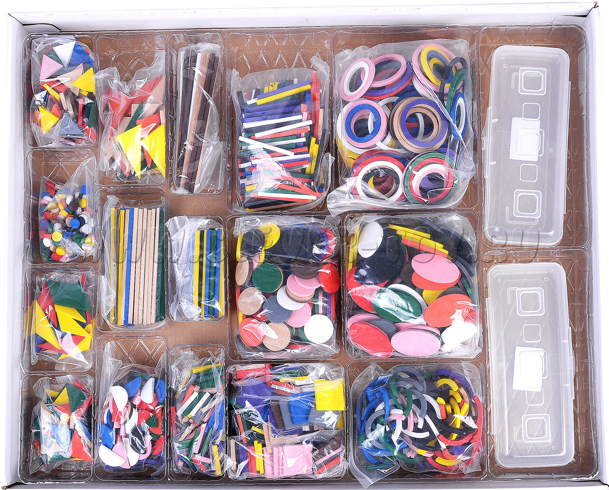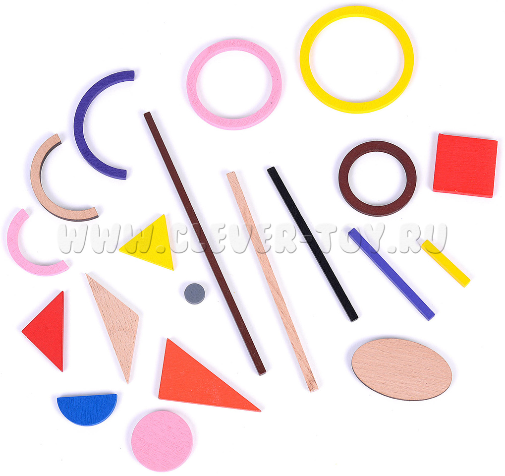 - Геометрические фигуры: треугольники, круги, полукруги, кольца, полукольца, округлые фишки, овалы, палочки разной длины, квадраты.