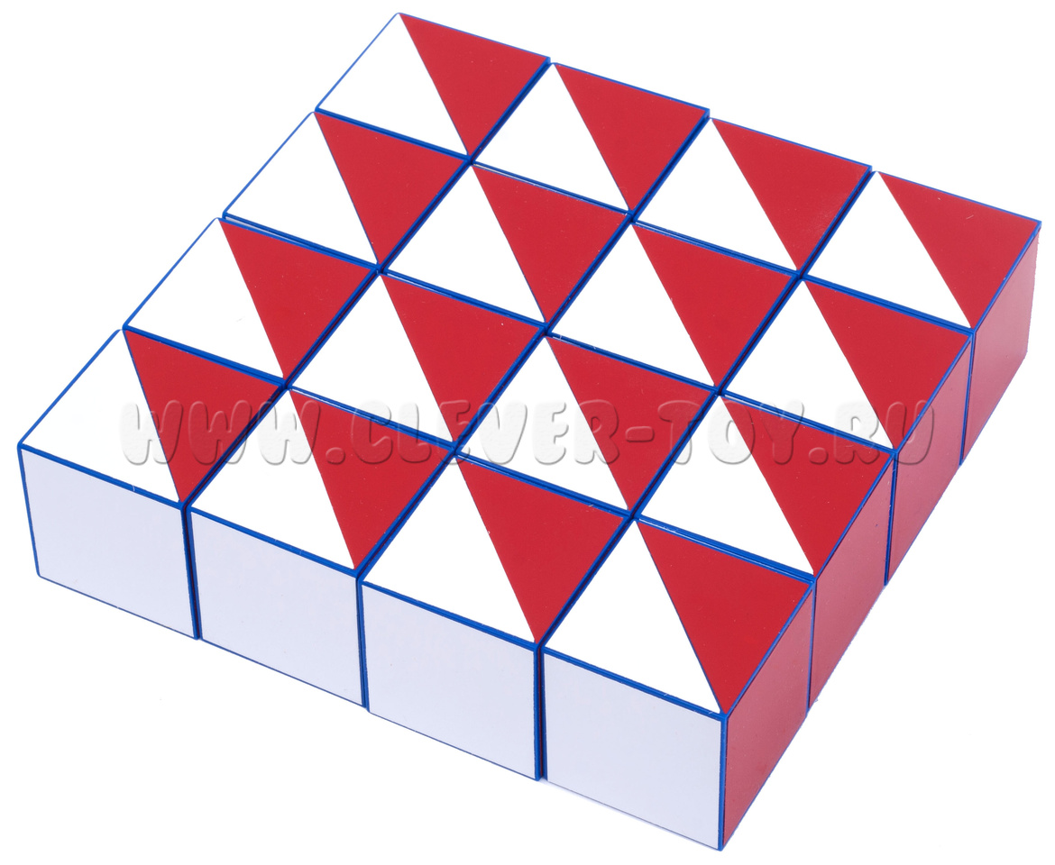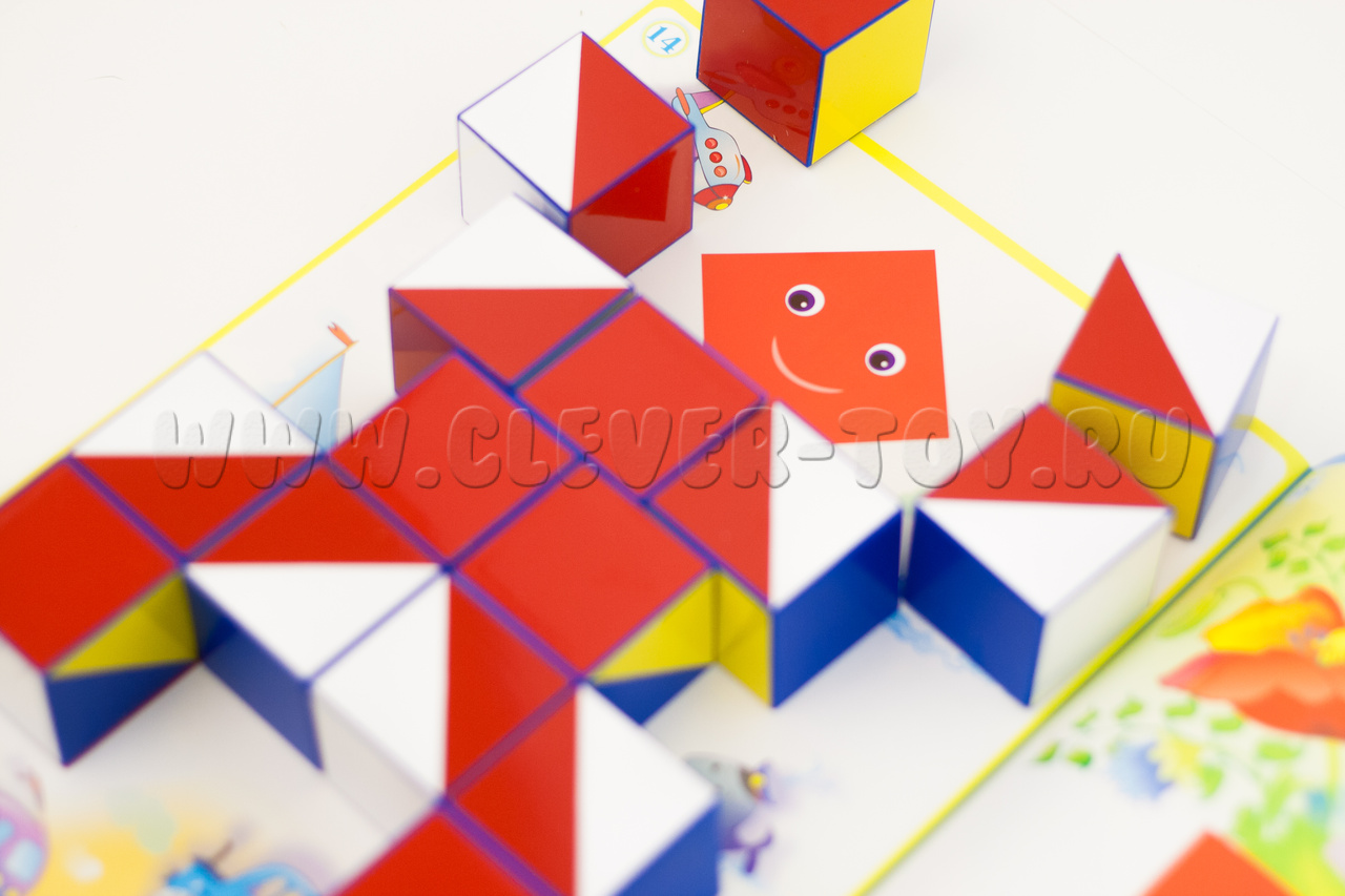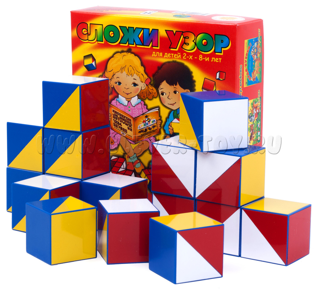 Развивающая игра состоит из 16 кубиков, грани которых окрашены в четыре цвета (красный, желтый, синий, белый) определенным образом. Каждой грани соответствует свой узор.