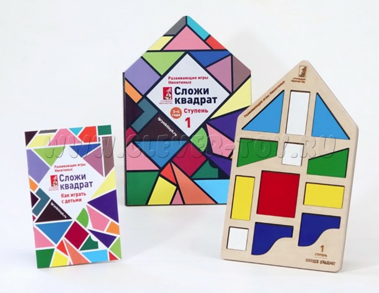 Данный набор это первая ступень в развивающей серии игр от Никитиных "Сложи квадрат", предназначен для детей от 2 до 4 лет. В следующих наборах (ступенях) игра будет усложняться.