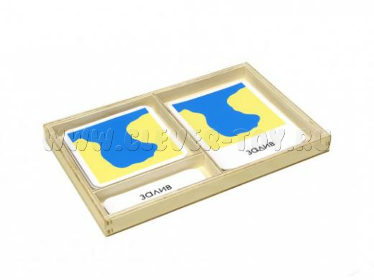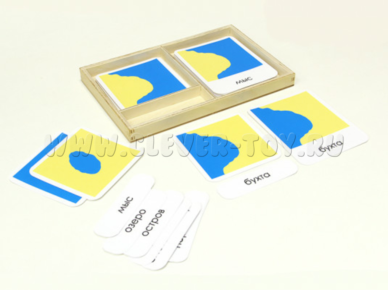 Материал состоит из карточек с изображением и надписью пяти видов участка суши (остров, полуостров, …) и пяти видов водной части (озеро, пролив,...)