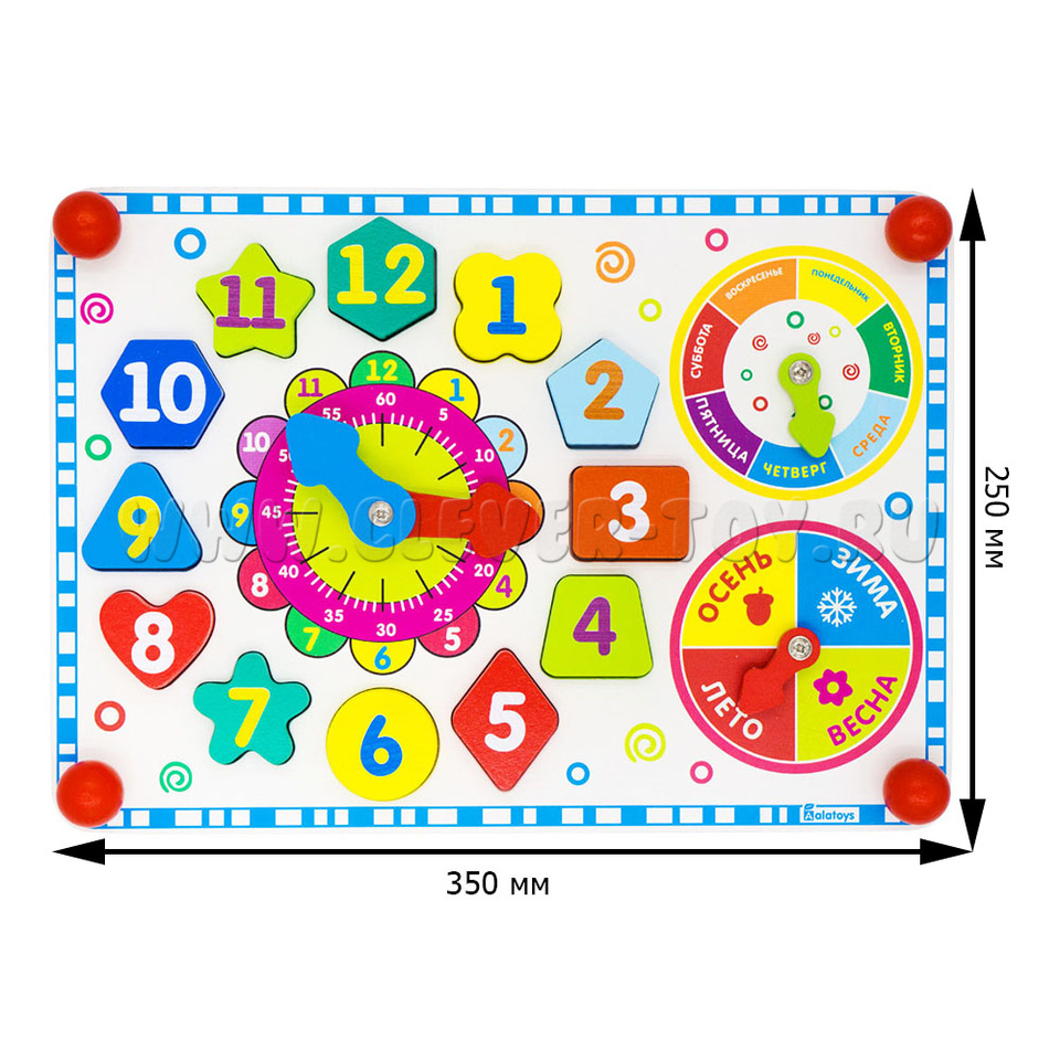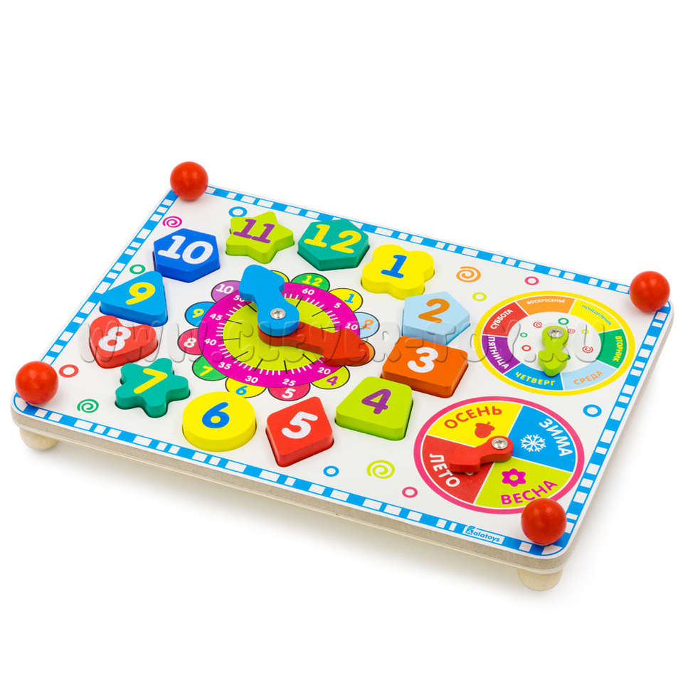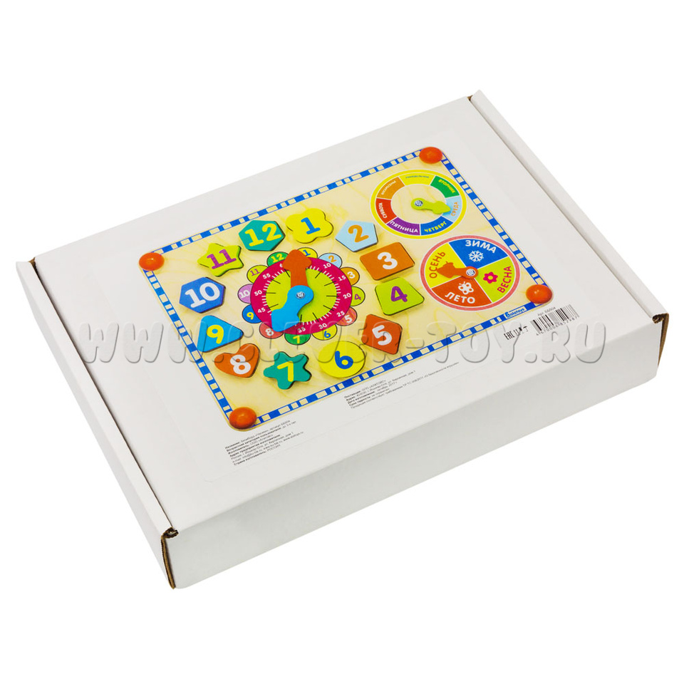 Фигуры расположены вокруг циферблата. С обозначением цифр от 1 до 12, разной формы и разных цветов. Поможет малышу познакомиться с геометрическими фигурами, развить логику, мелкую моторику.