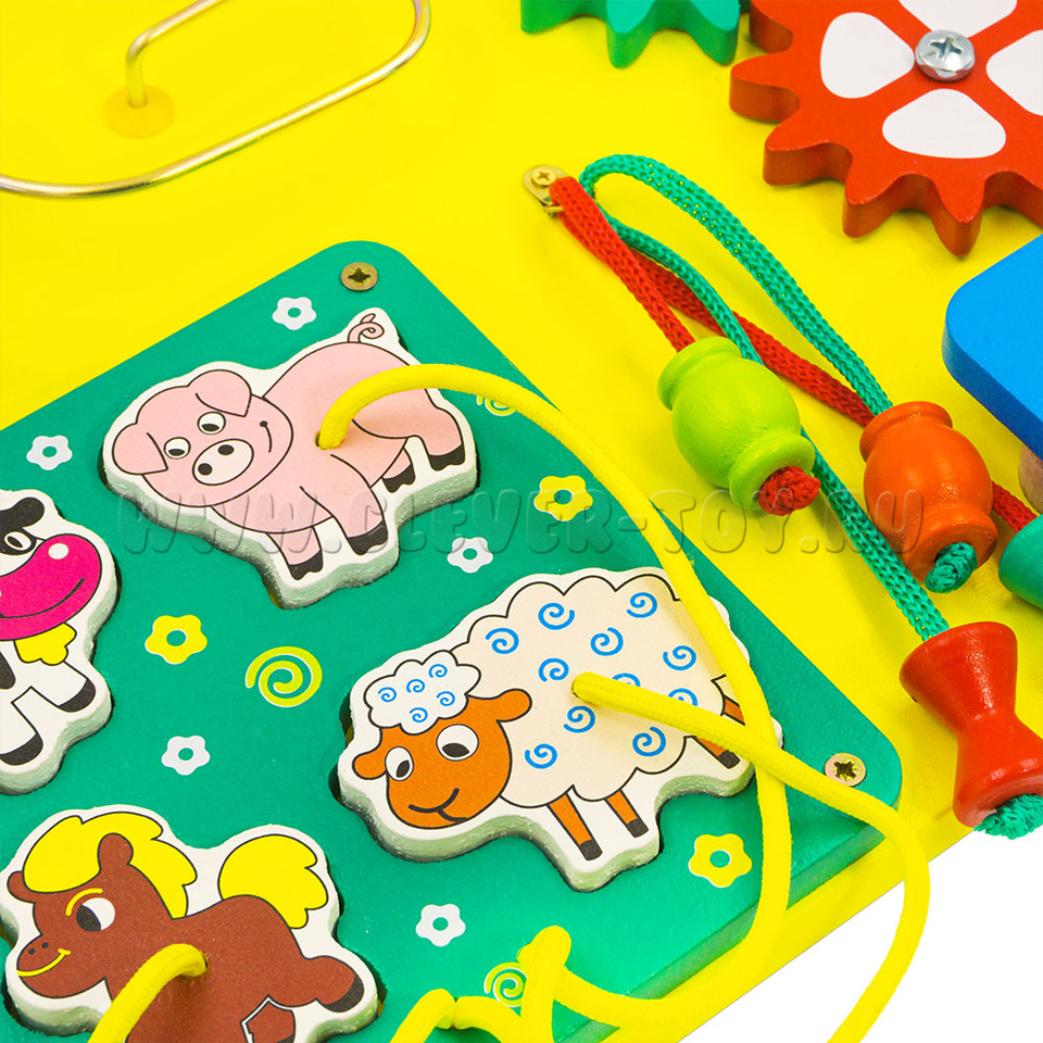 Развивающая доска с интерактивными элементами – незаменимая вещь в доме, где растёт маленький гений. Дети обожают разглядывать и трогать игровые элементы, прикреплённые к доске.