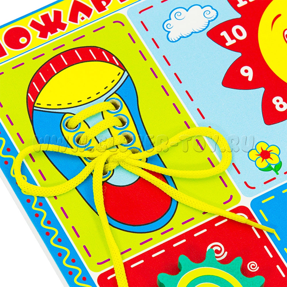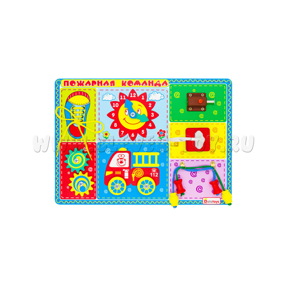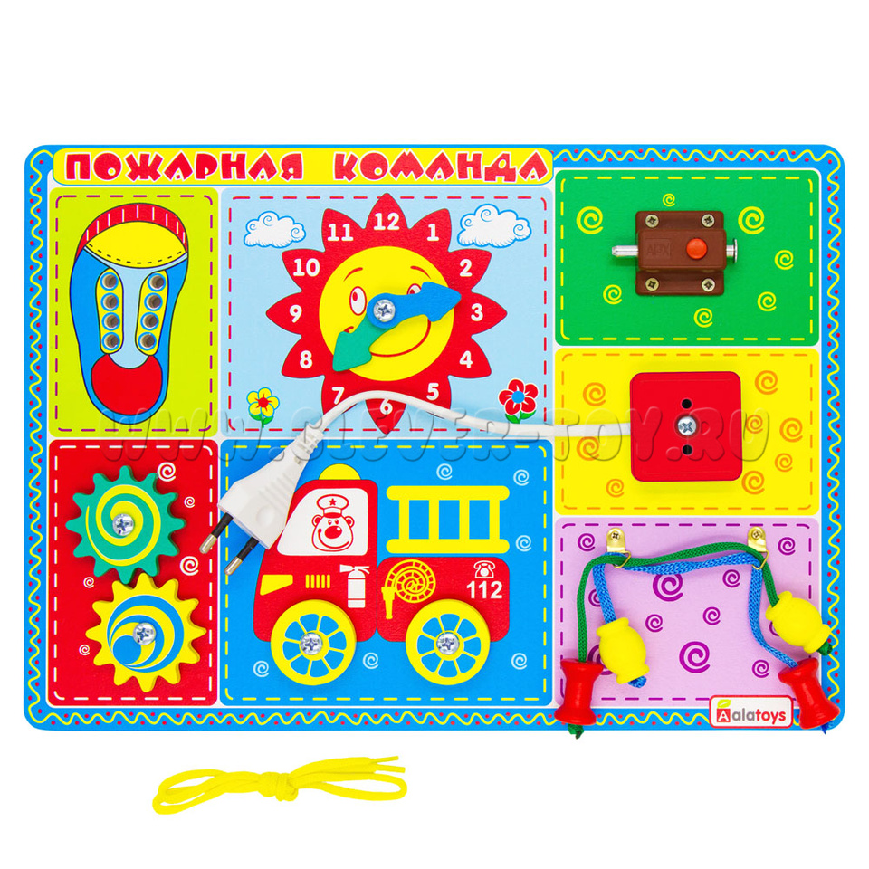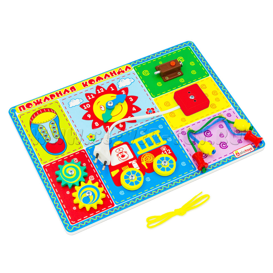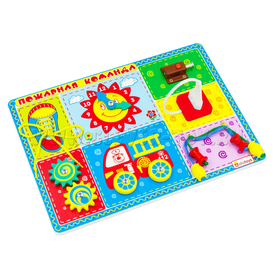 Деревянная развивающая доска «Пожарная команда» от одного из крупнейших производителей игрушек – фабрики «Алатойс». Все игрушки фабрики задействуют мелкую моторику, а, значит, развивают речь ребёнка.