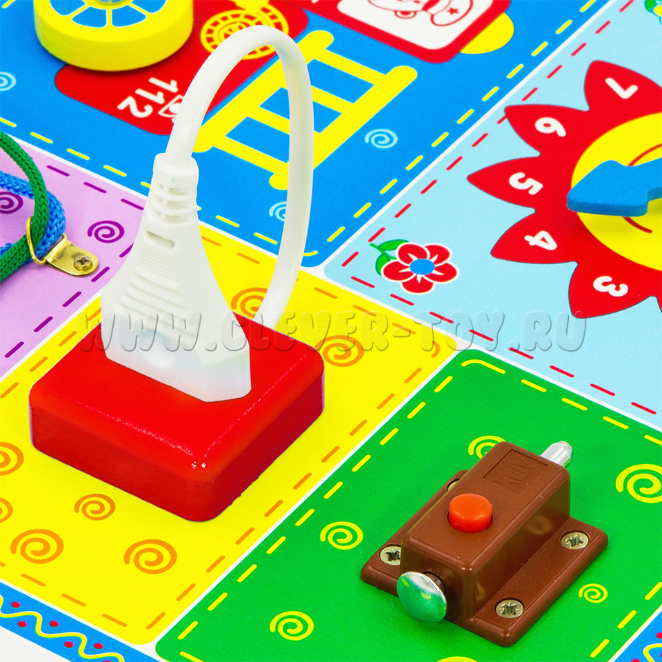 Интерактивный элемент. Ребёнок сможет играть самостоятельно, защелкивая шпингалетик и нажимая на кнопочку. - Розетка +вилка 1 шт.