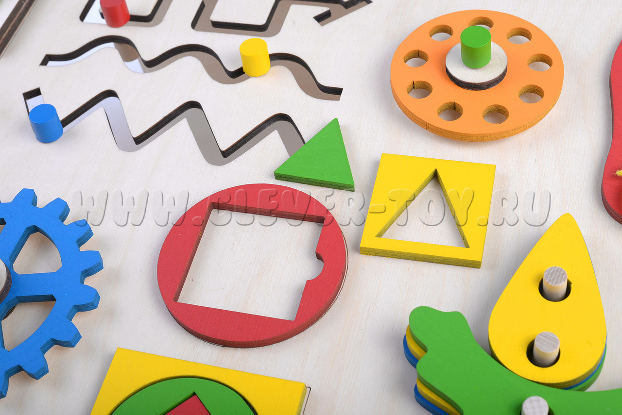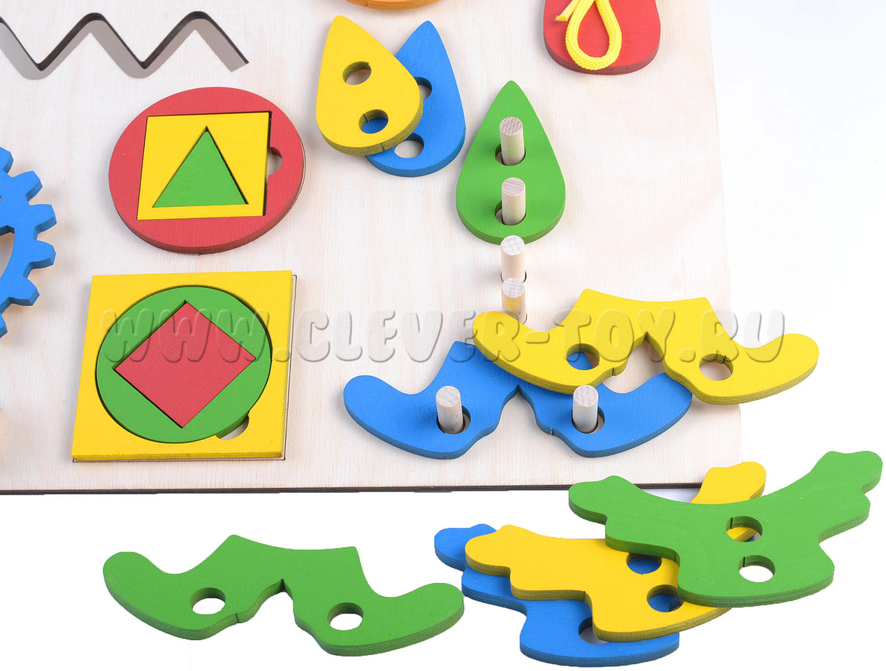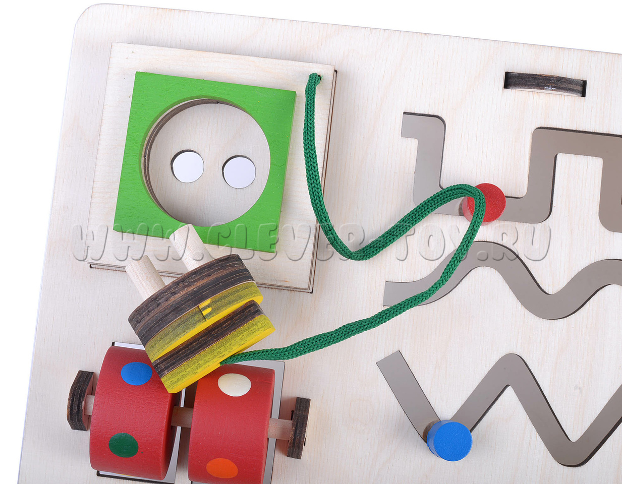 Развивающая доска ручной работы выполнена из экологически чистого материала – берёзы, абсолютно безопасна для детских пальчиков, все игровые элементы хорошо отшлифованы, покрыты яркой безопасной краской на водной основе.