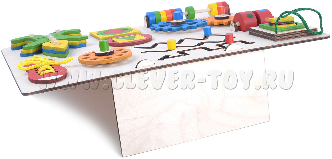 Бизиборд устойчиво размещается на горизонтальной поверхности, также можно закрепить его на стену. В комплект входит удобная деревянная подставка.
