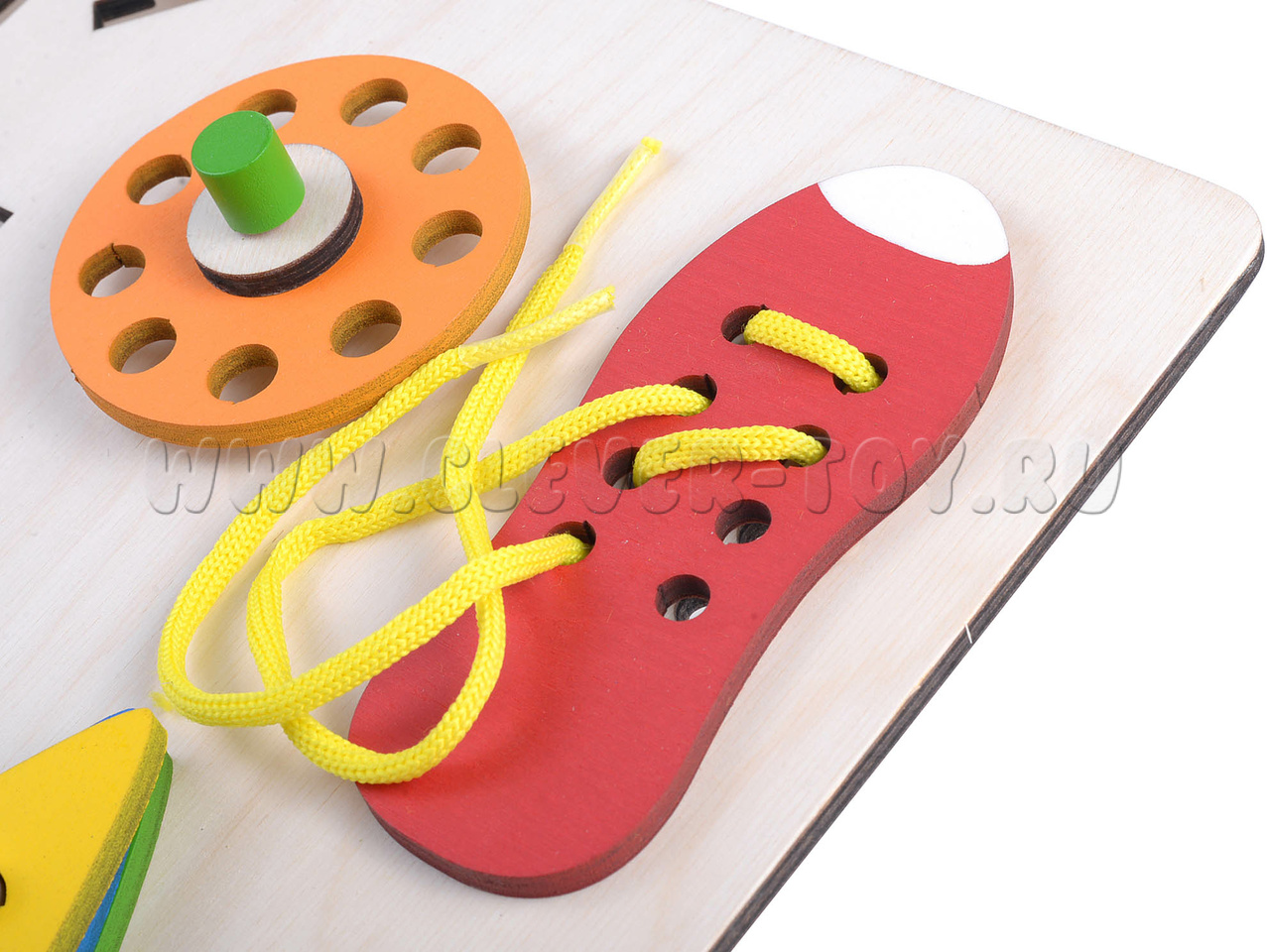 - Шнуровка «Ботинок» – малыш научится завязывать жёлтый шнурочек, а затем, и свои ботиночки, научит накладывать стежки.