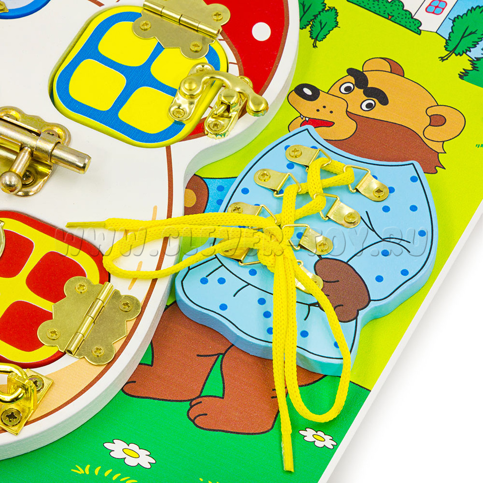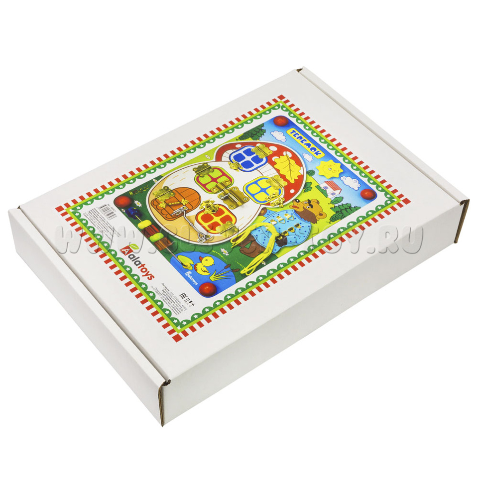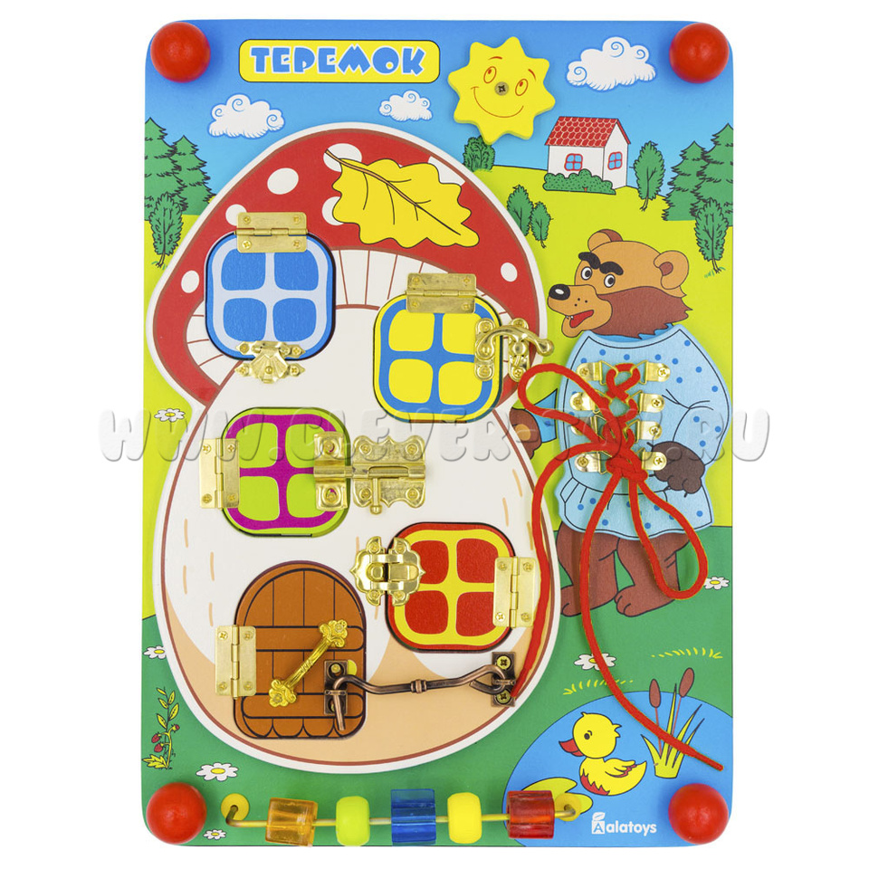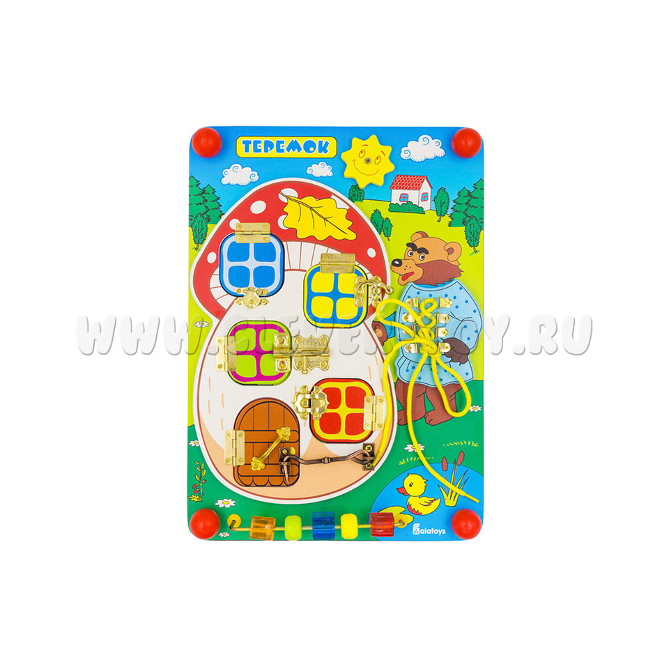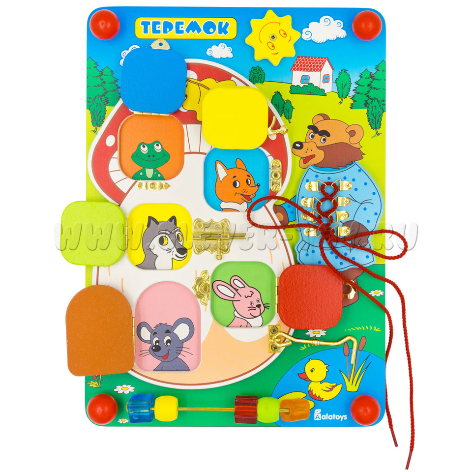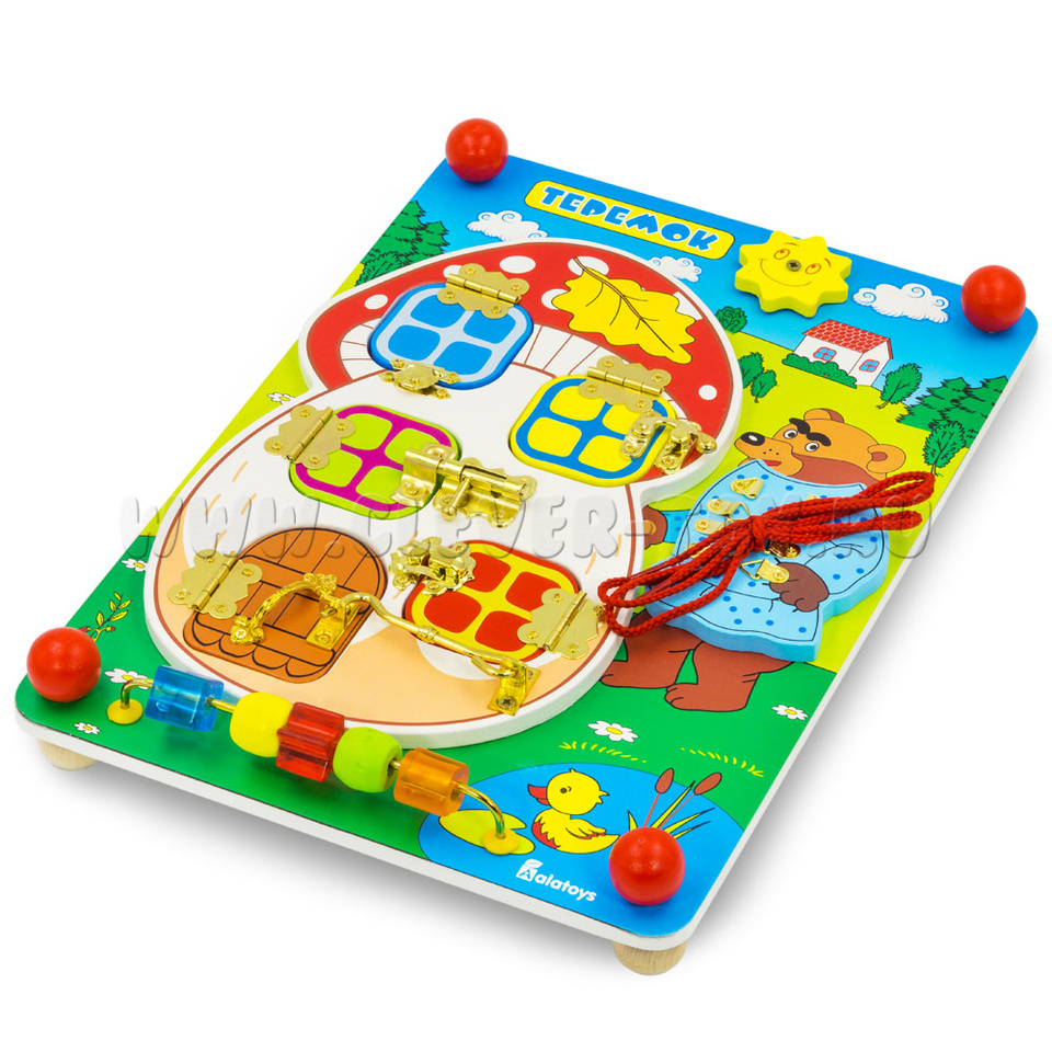 Если хотите порадовать малыша, то обязательно нужно купить бизиборд «Теремок», который состоит из: