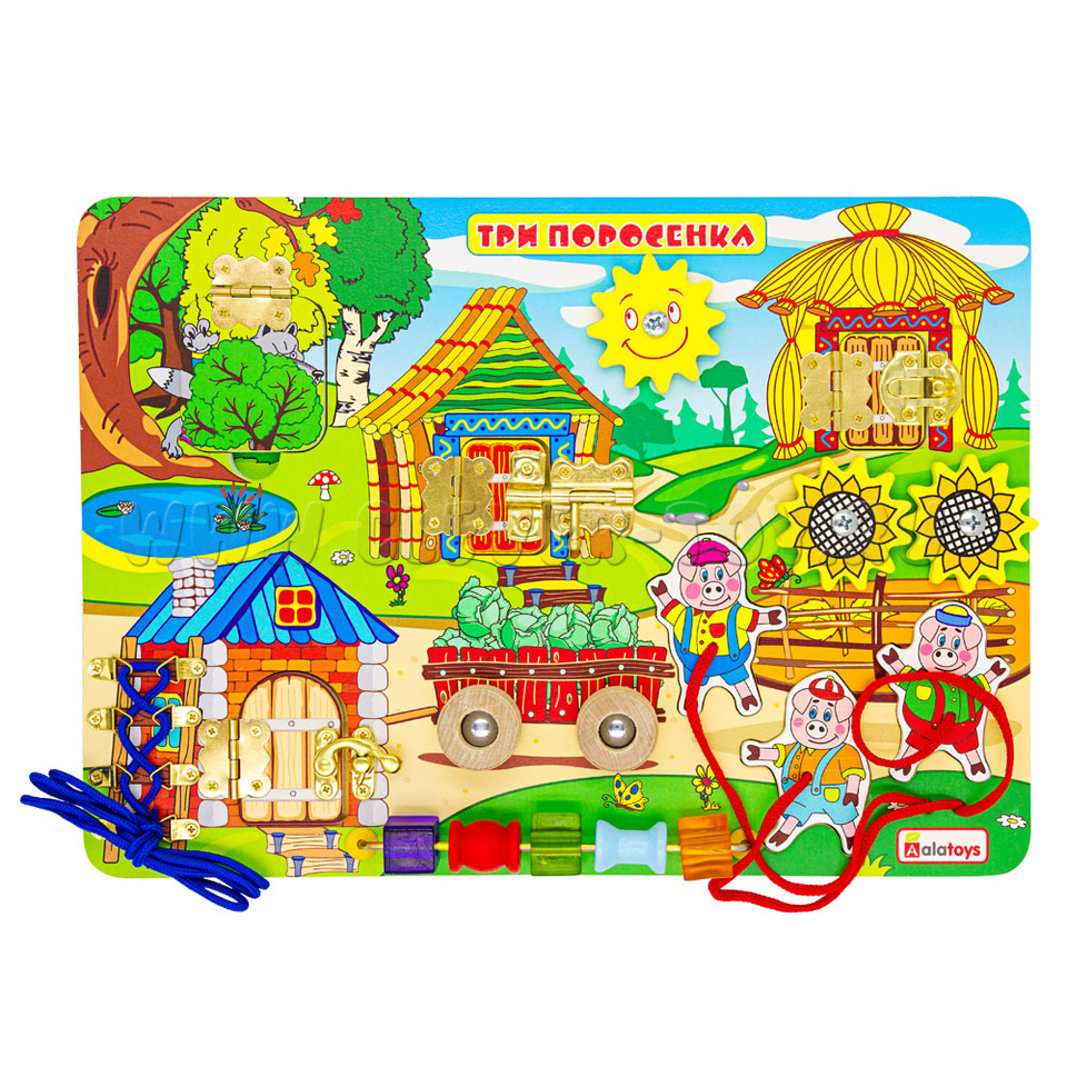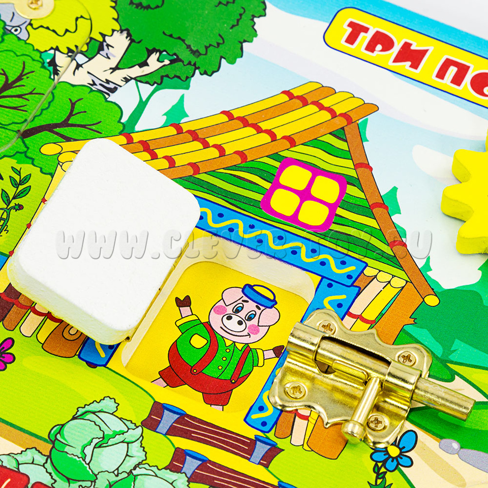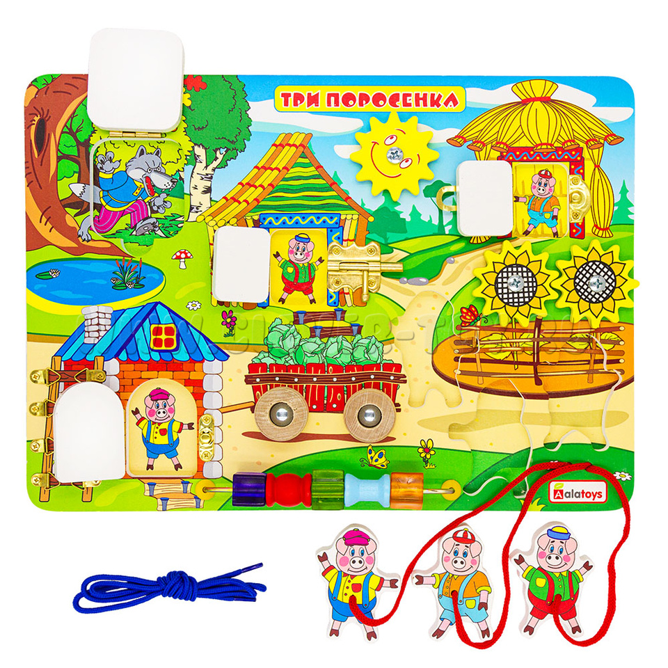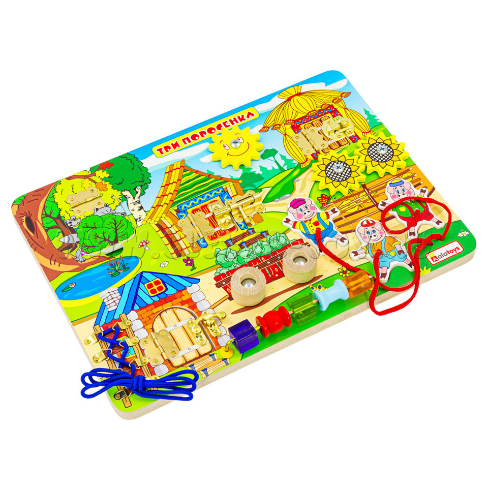 Если хотите удивить малыша, то обязательно нужно купитьбизиборд «Три поросенка», который состоит из: