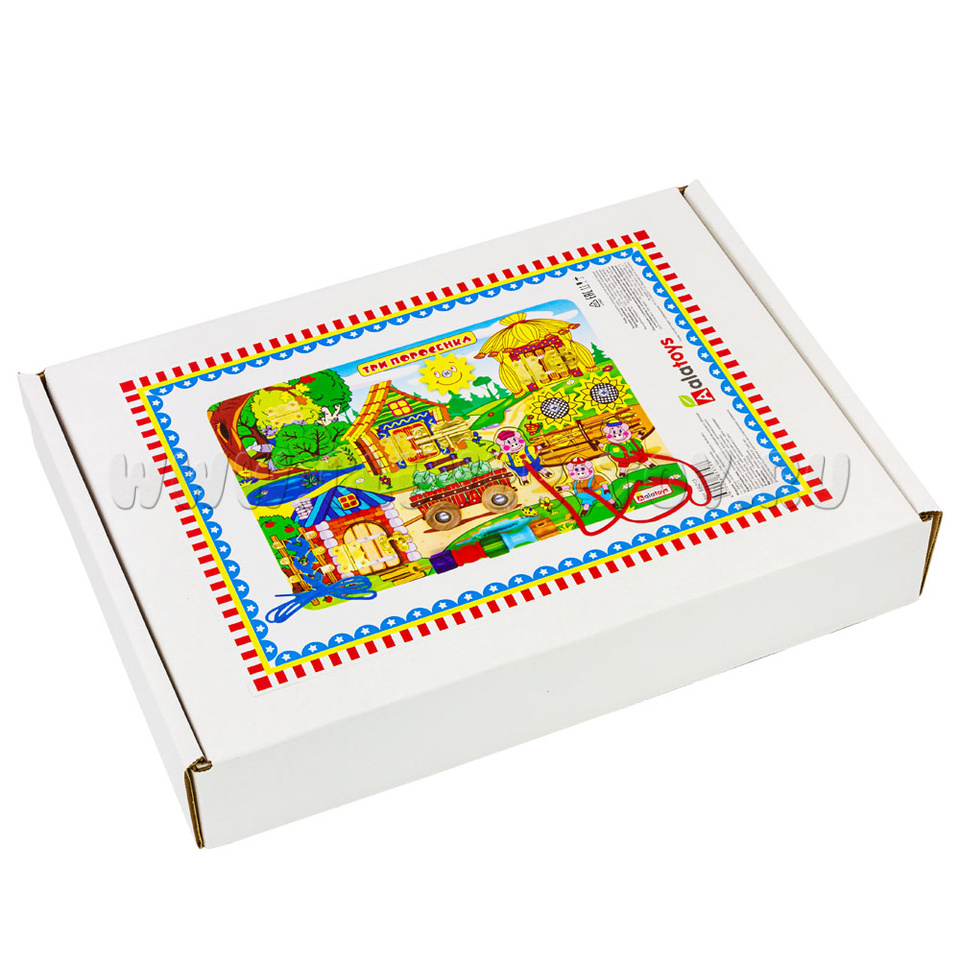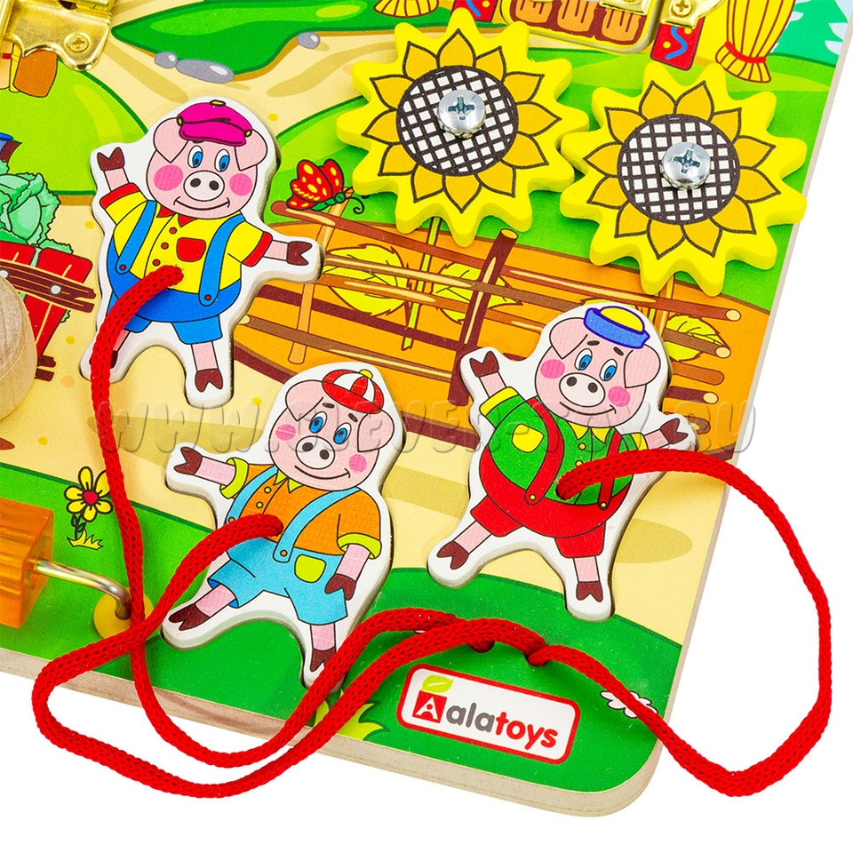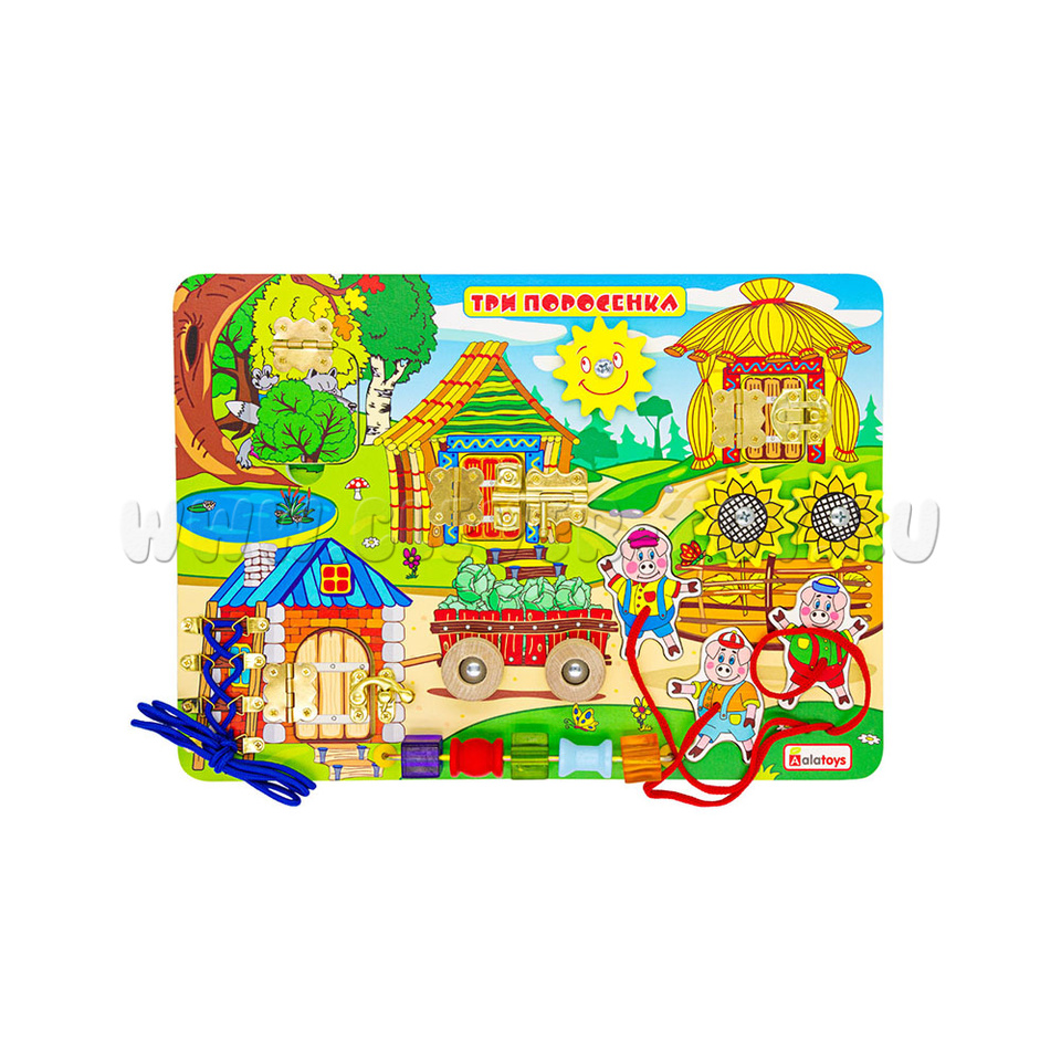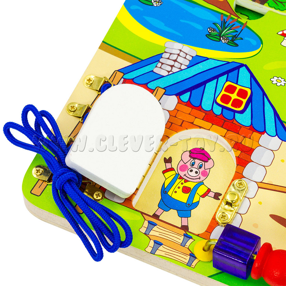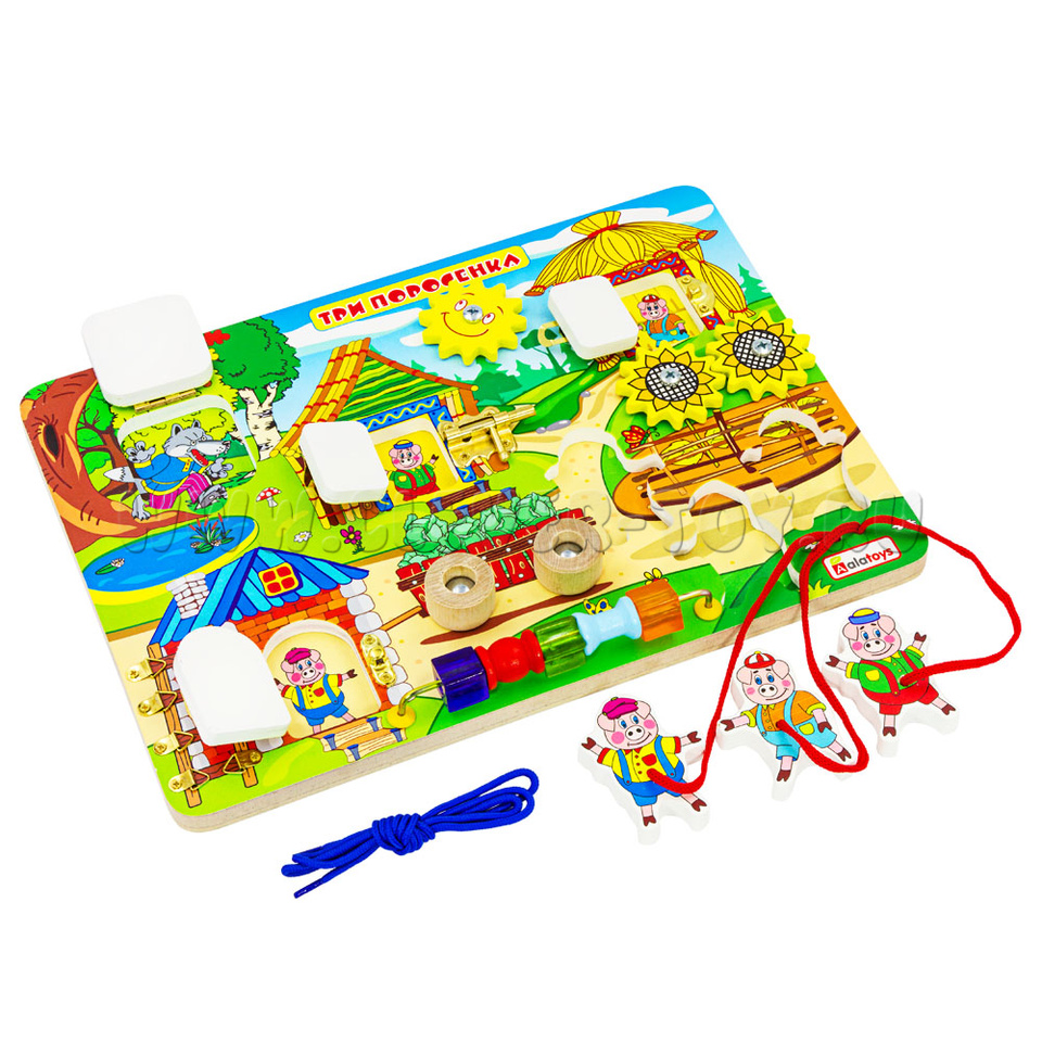 Если хотите удивить малыша, то обязательно нужно купитьбизиборд «Три поросенка», который состоит из: