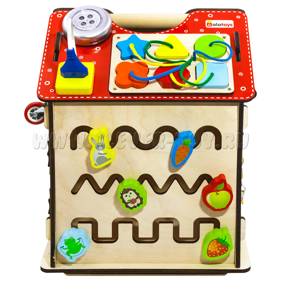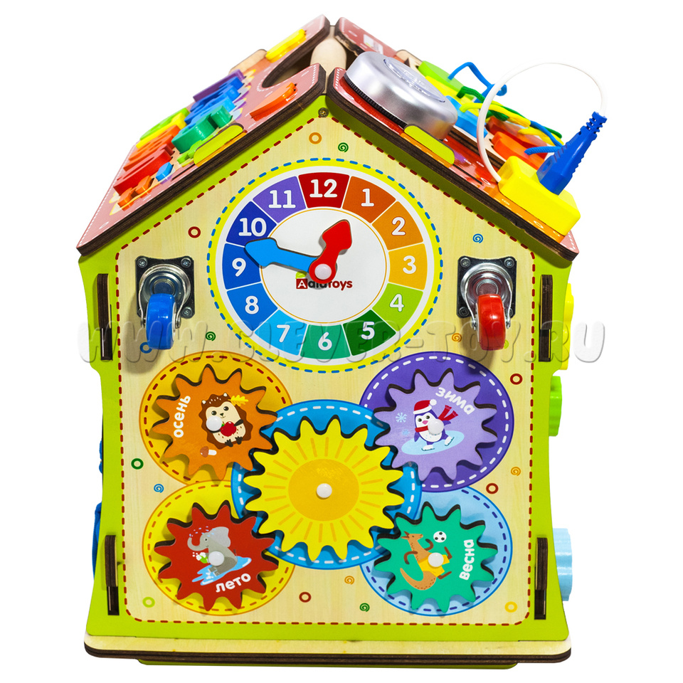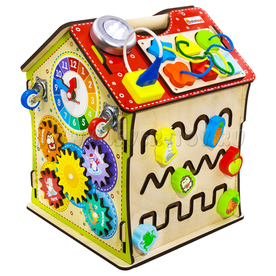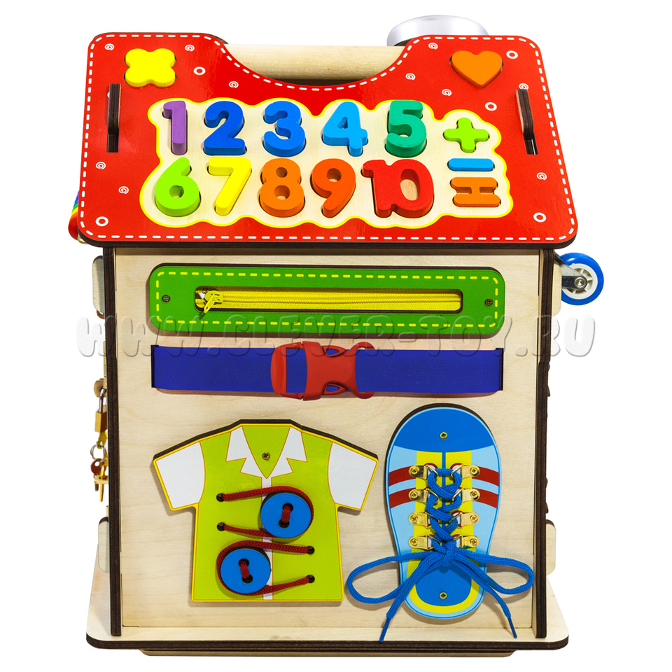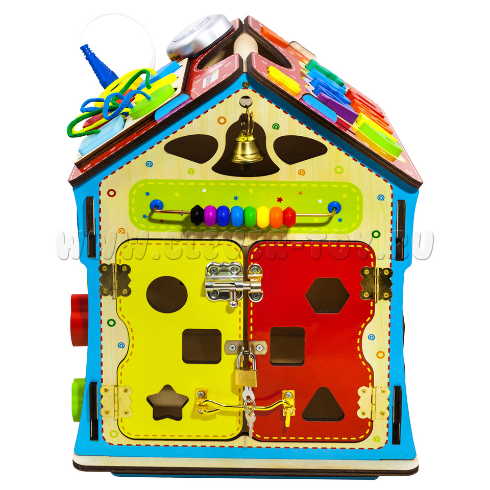 Бизиборд в виде домика – это 6 увлекательных досок с целым множеством развлечений на них. Это точно надолго увлечет ребенка!
