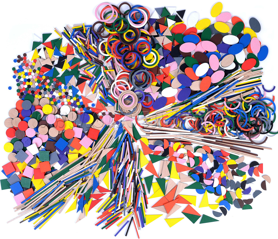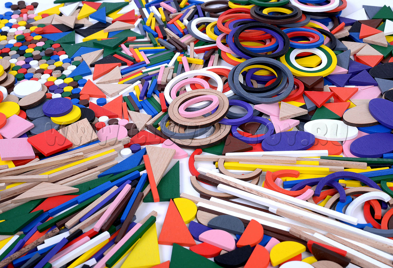 - Геометрические фигуры: треугольники, круги, полукруги, кольца, полукольца, округлые фишки, овалы, палочки разной длины, квадраты.
