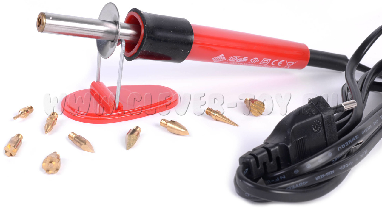Выжигатель рисует тончайшие линии, с его помощью можно создавать великолепные художественные работы и даже выжигать портреты. Фигурные насадки в комплекте позволят выводить фигурные узоры, переносить самые смелые идеи и яркие фантазии на полотно. Выжигает на любых породах древесины. К комплекту прилагается инструкция, доступно объясняющая принцип работы прибора.