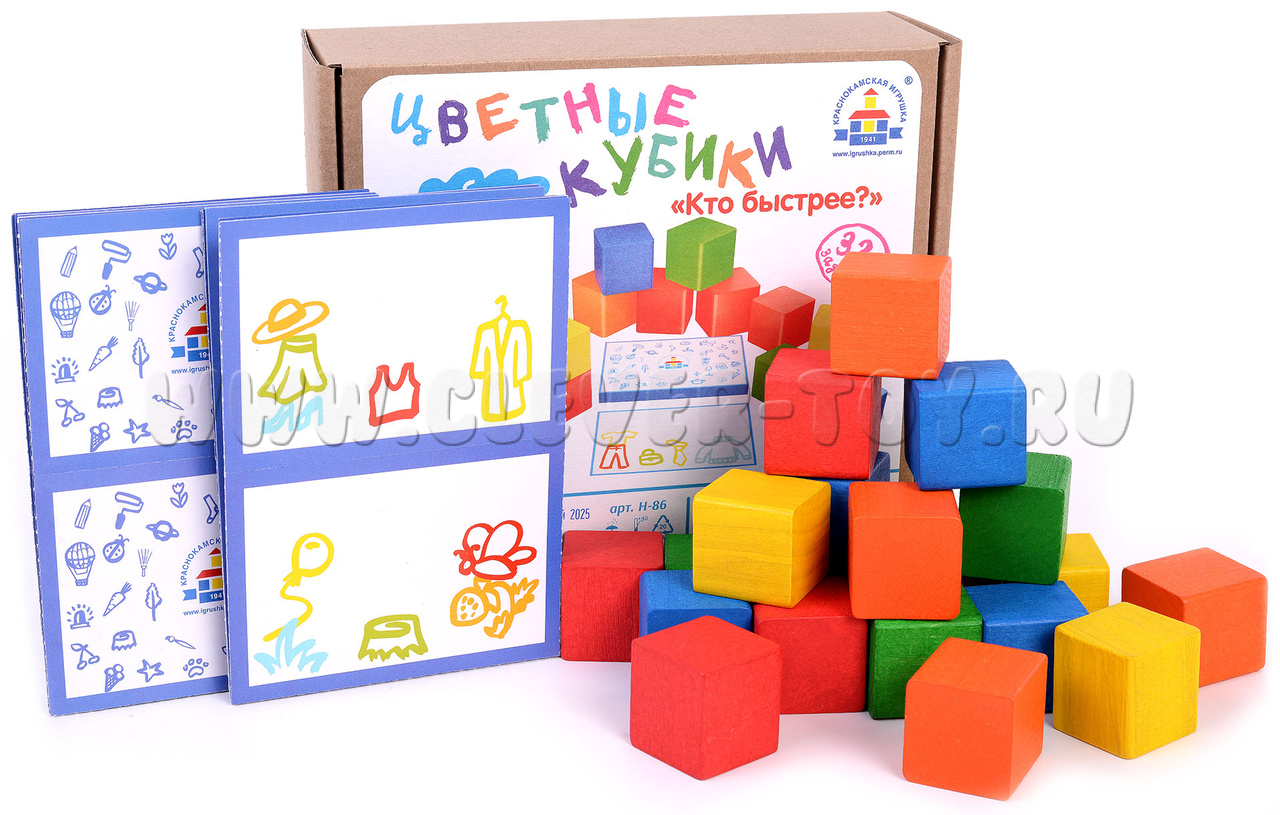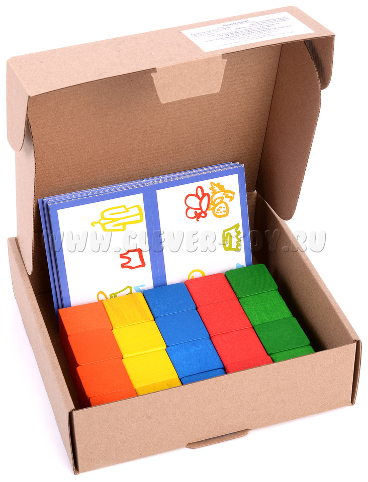 Правила. Игроки расставляют кубики по соответствующим цветам элементов на карточке с заданием. Кто первым это сделает - забирает картинку. Победителем окажется обладатель наибольшего количества карточек.