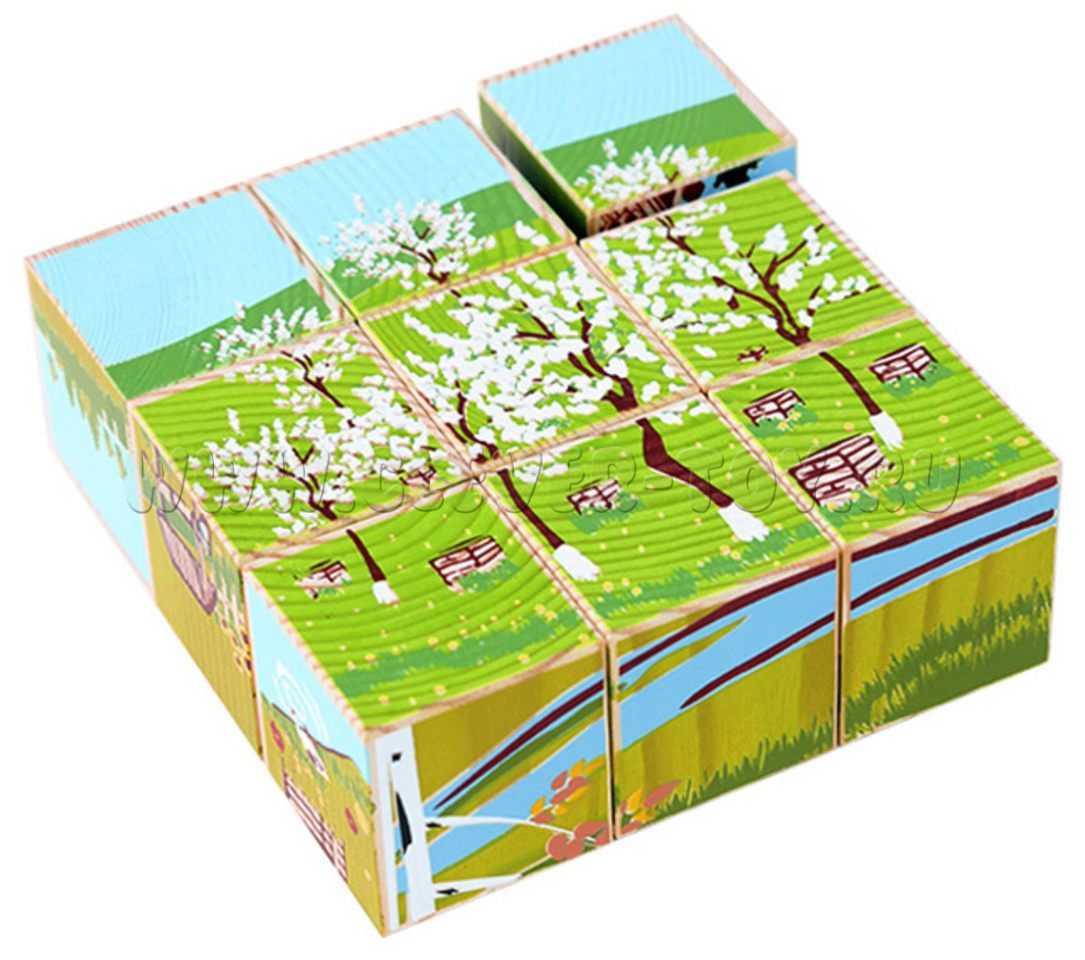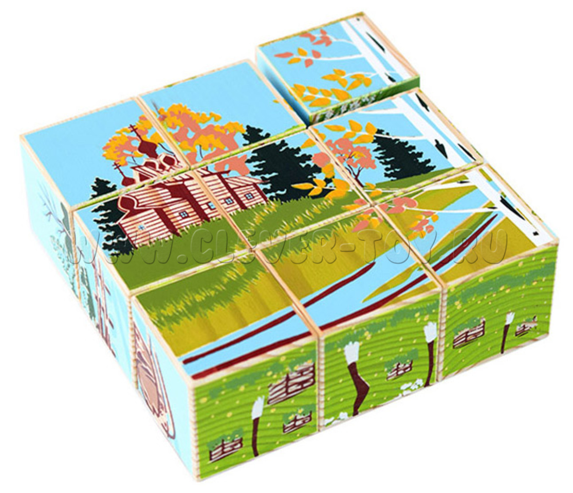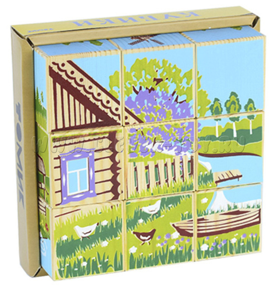 В наборе 9 деревянных кубиков с яркими изображениями пейзажей и быта деревни.