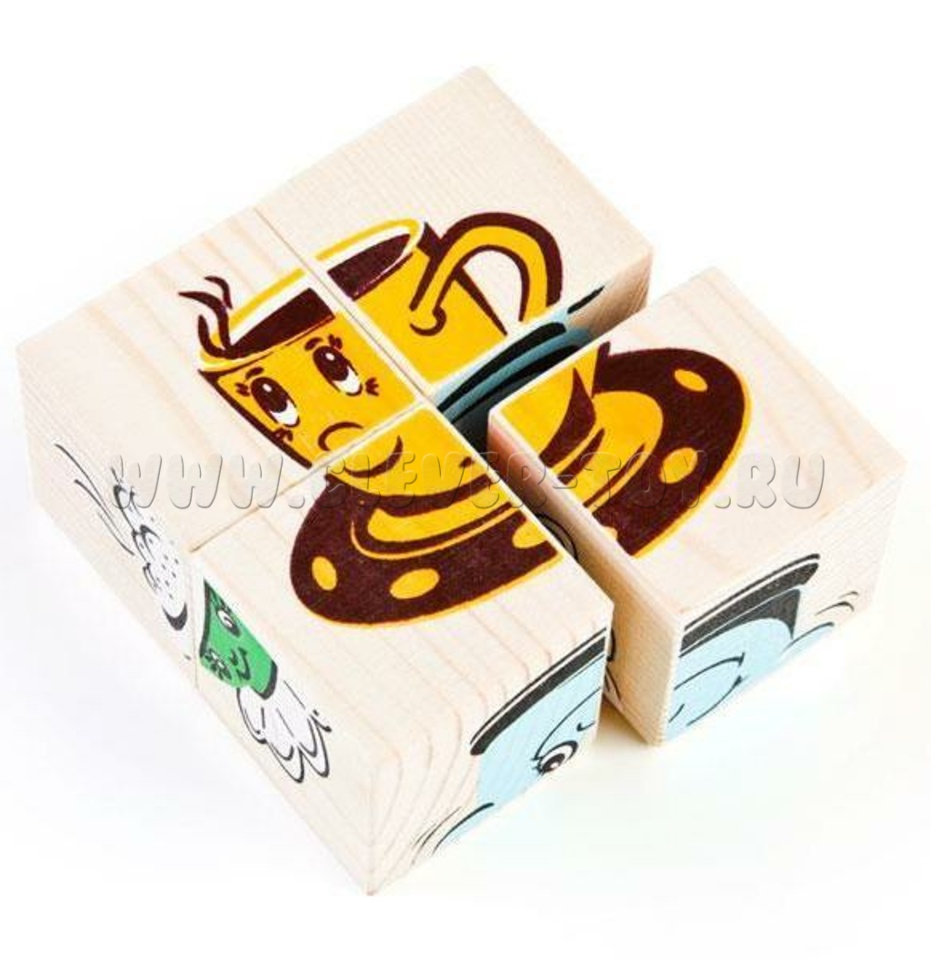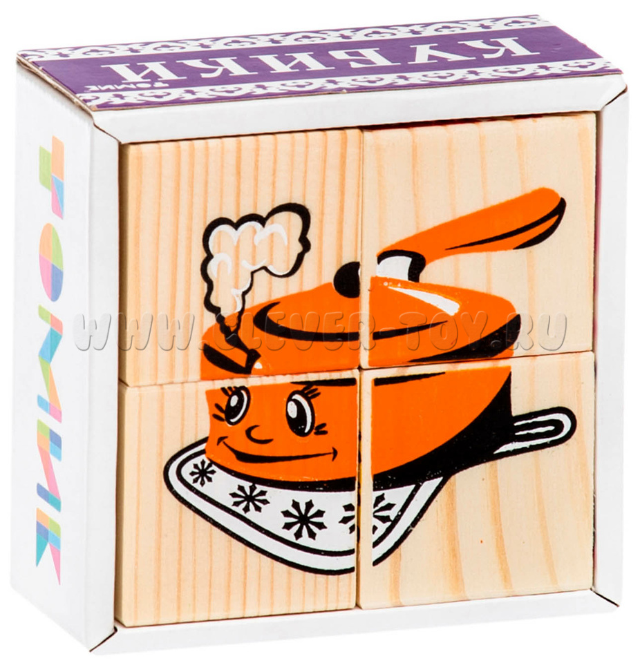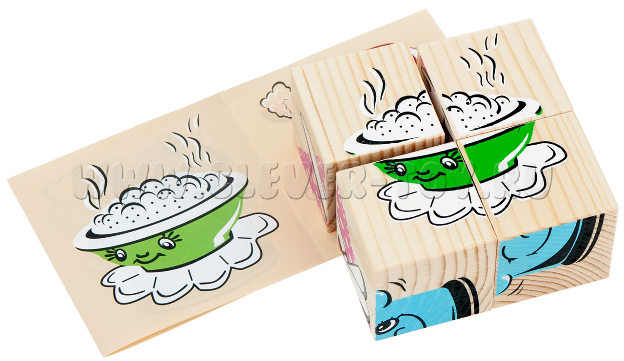 В состав входит четыре кубика, из которых ребенок может собрать 6 картинок посуды (чайник, столовые приборы, чашка, тарелка, кастрюля, сотейник).