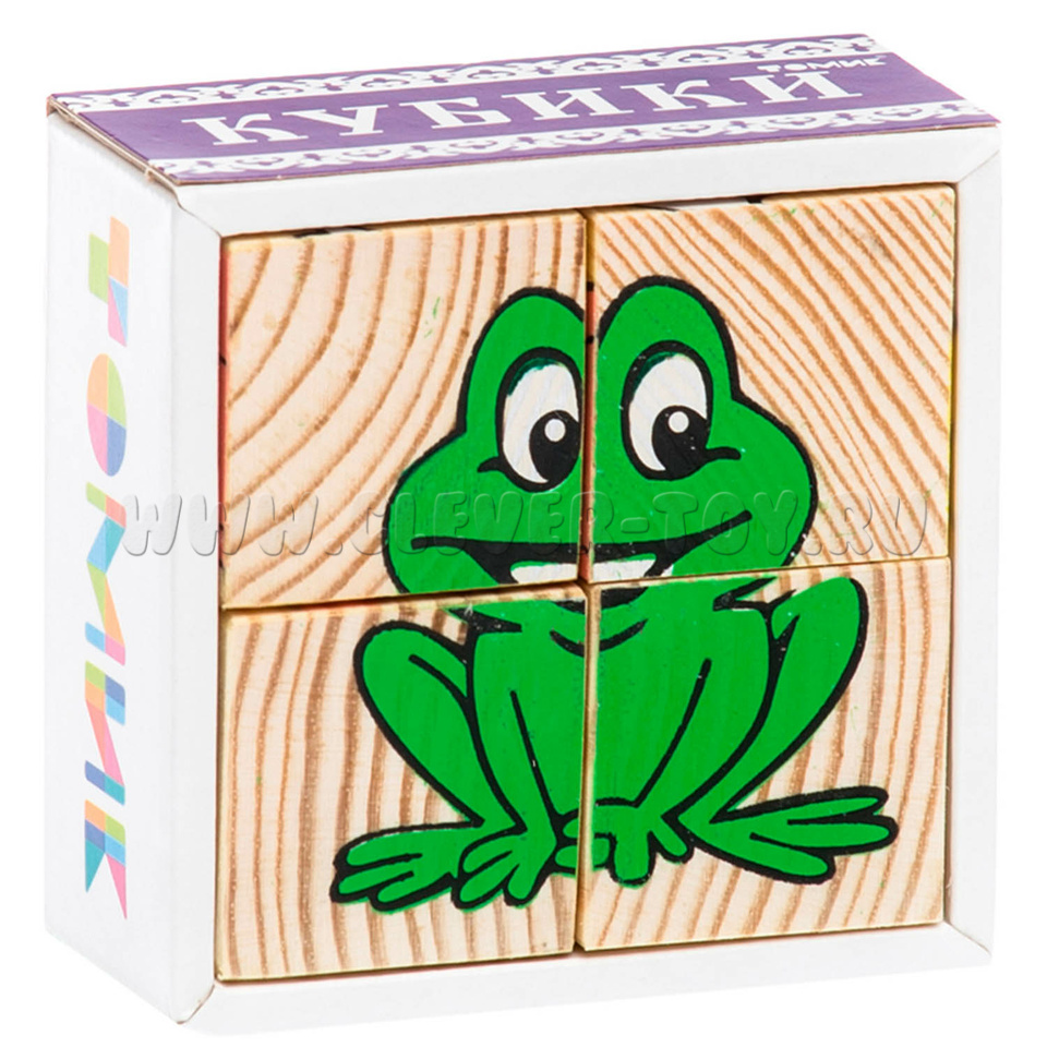 В состав входит четыре кубика, из которых ребенок может собрать 6 картинок животных.