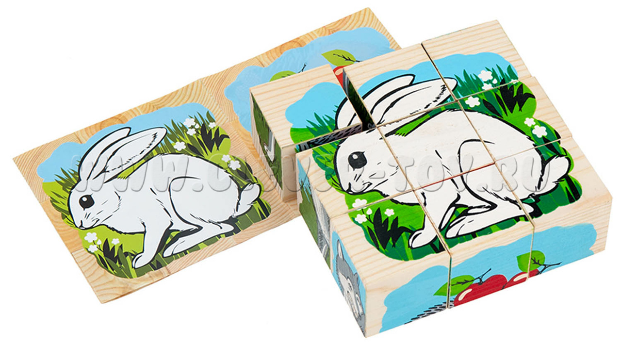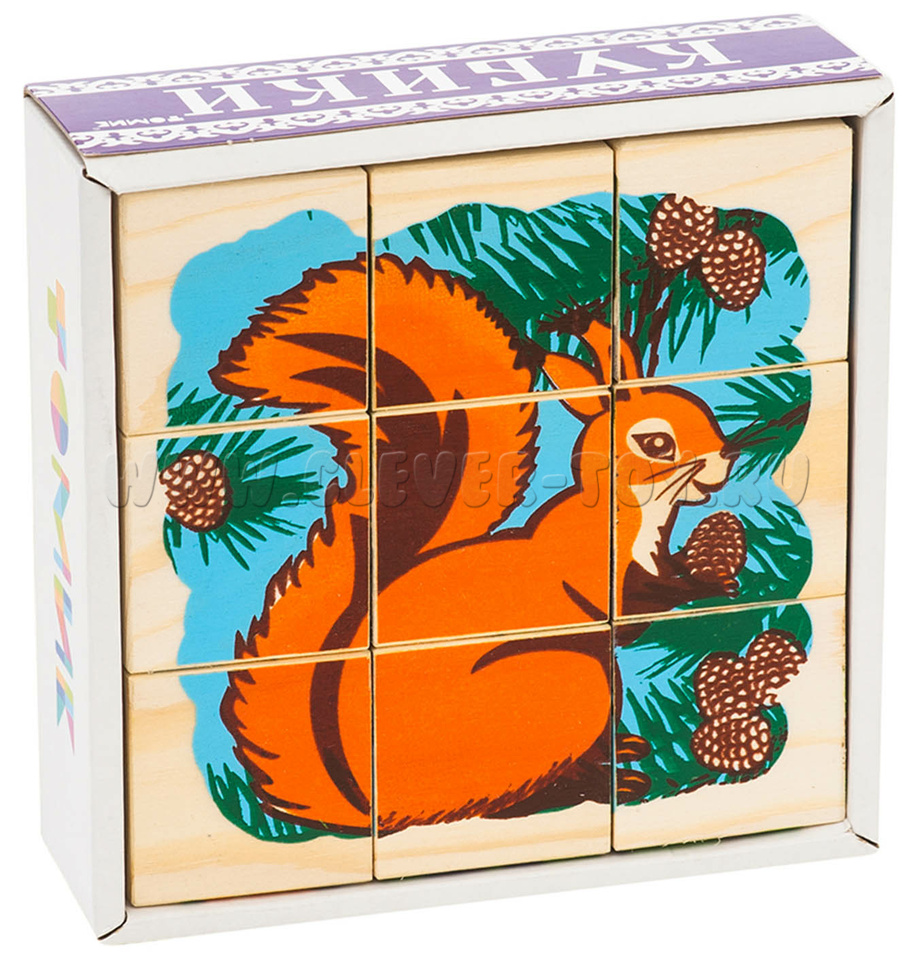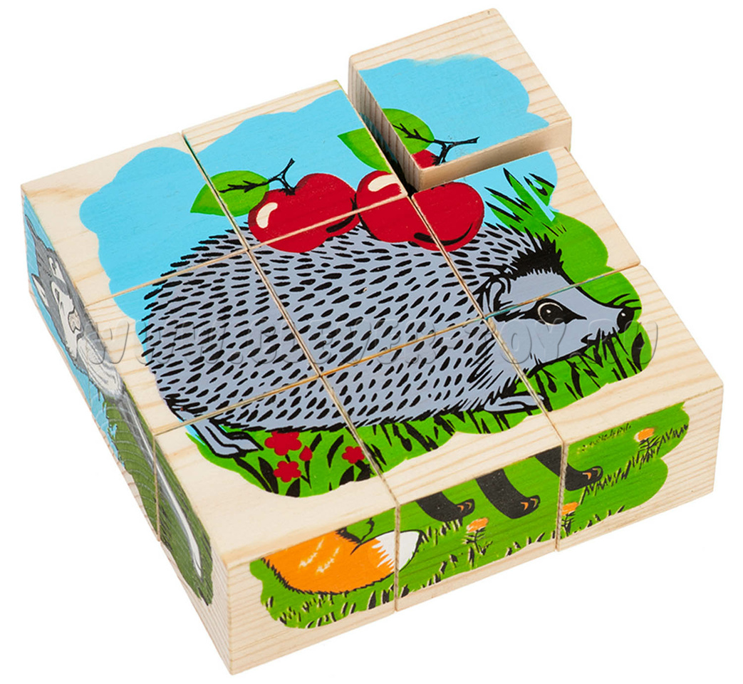 В состав входит девять кубиков, из которых ребенок может собрать 6 изображений лесных жителей. (мишка, зайка, лиса, белка, волк, ежик).