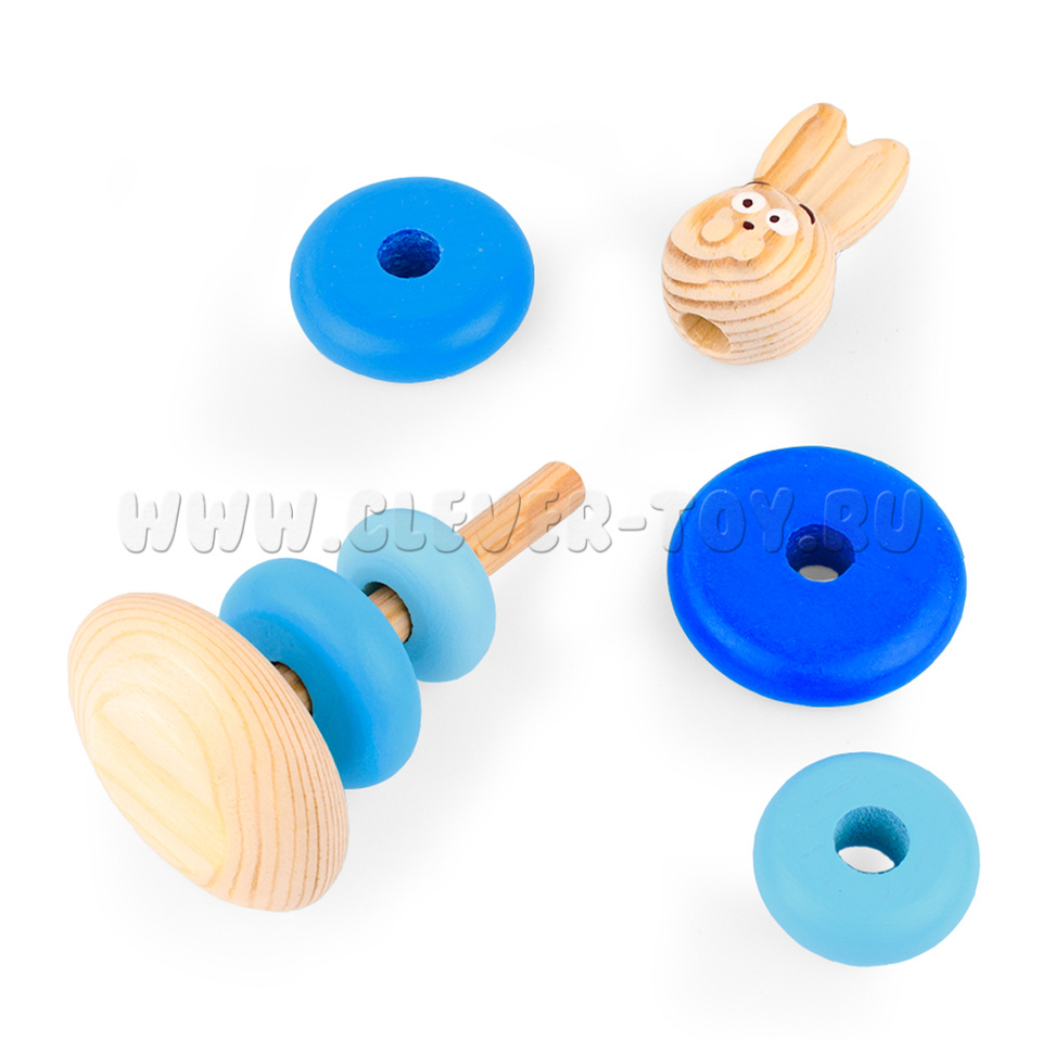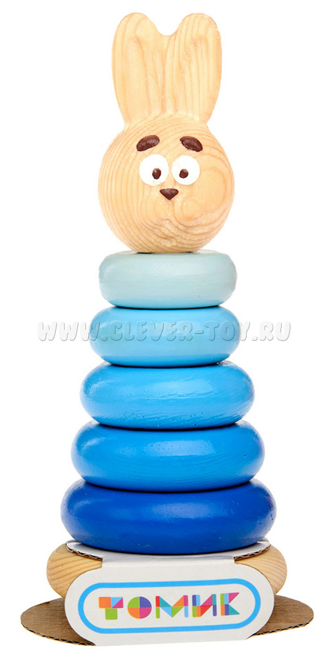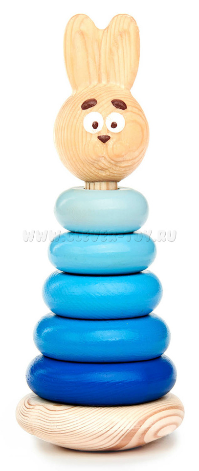 Пирамида "Зайчонок" состоит из 5 колец разных оттенков синего, головы зайчика и стержня с основанием.