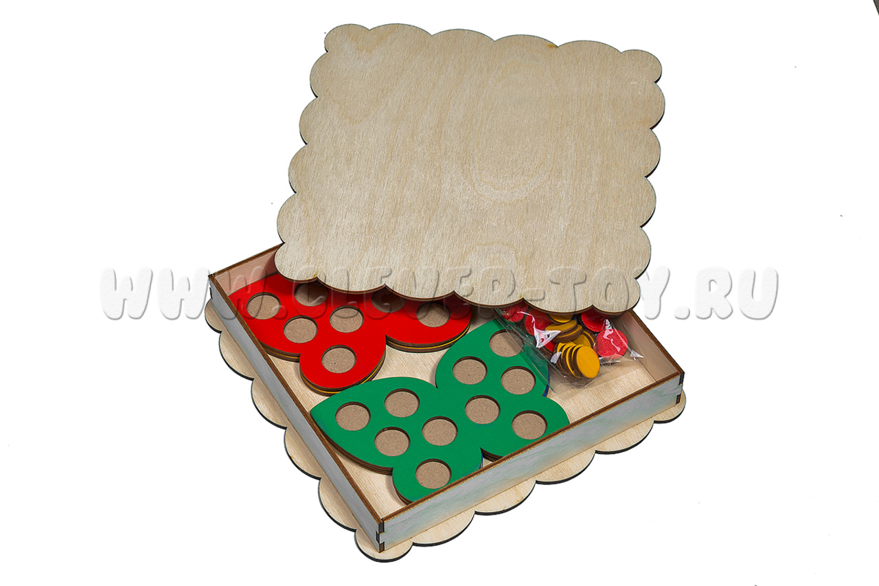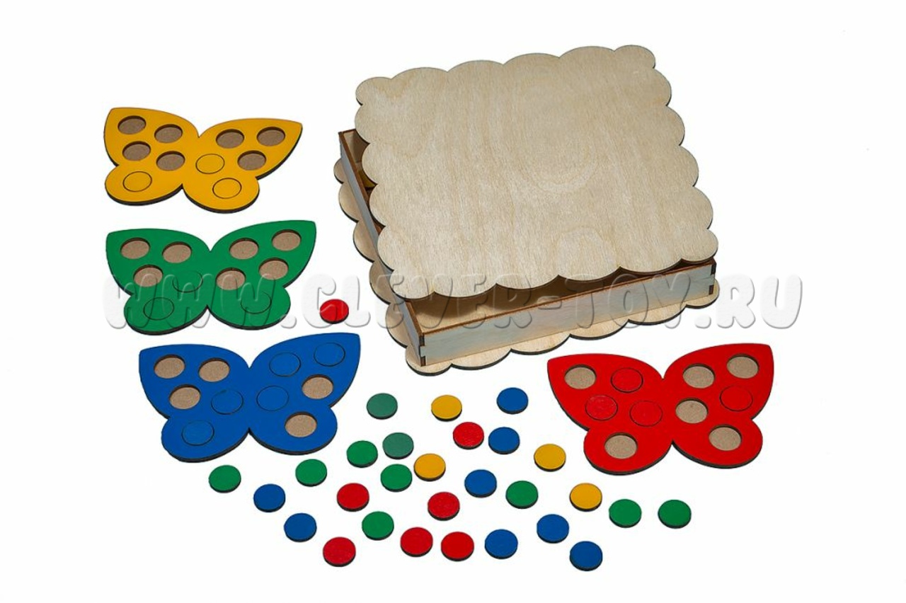 4 бабочки разных цветов (14*9см) и 40 кружков (4 цвета по 10шт, диаметр 2см) упакованы в деревянную коробку (21*21см).