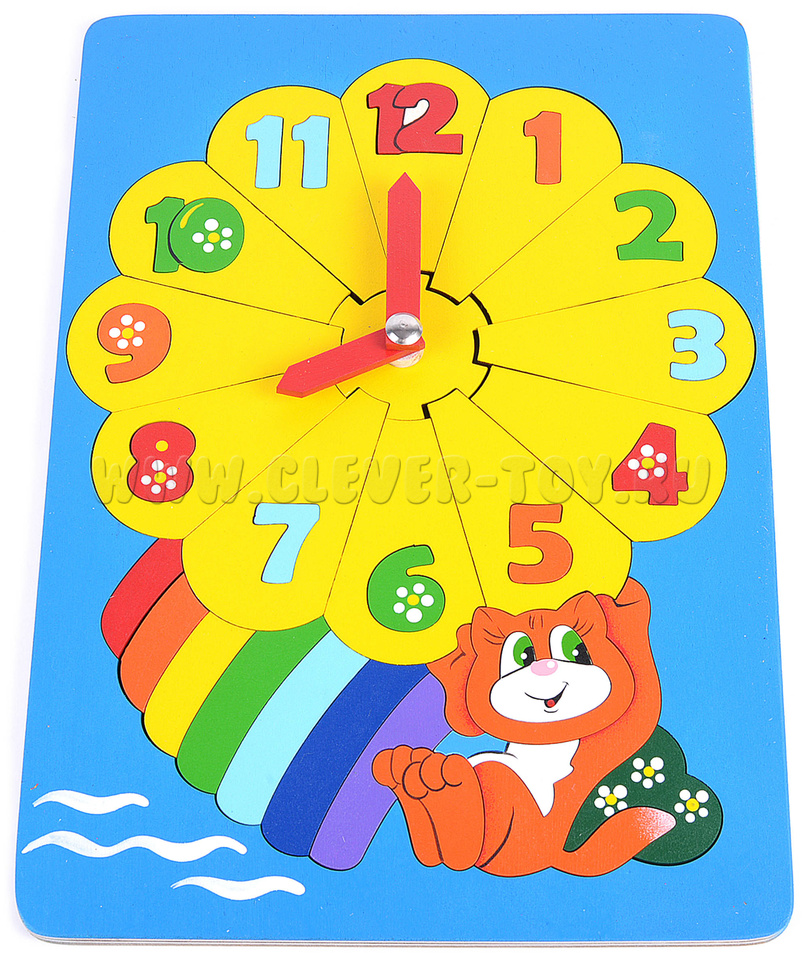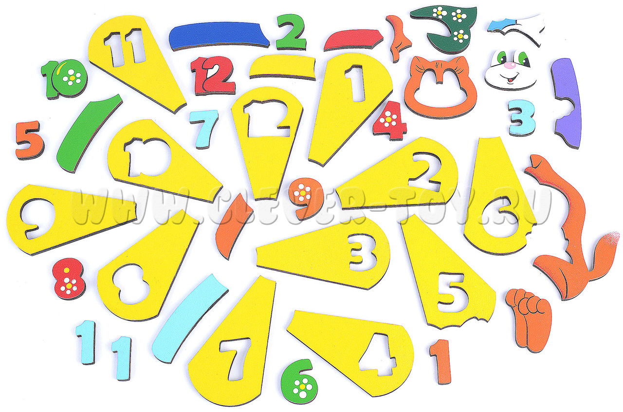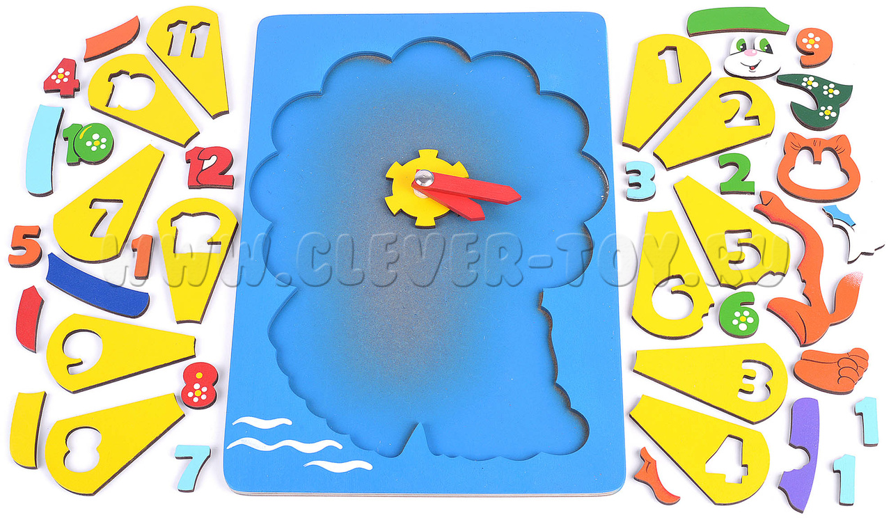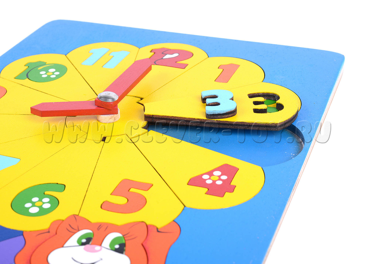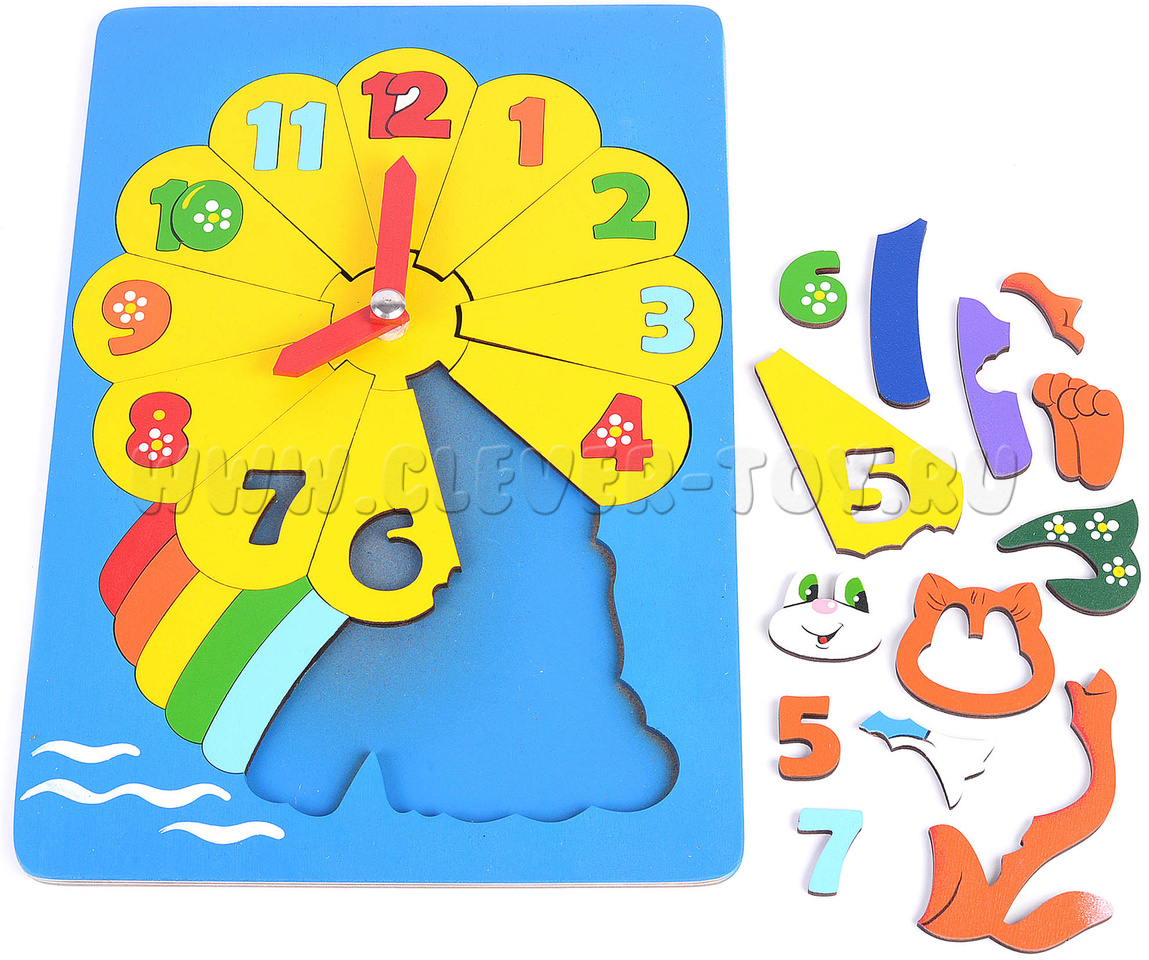 Набор состоит из схемы-раскраски, подложки и 38 съемных элементов. Стрелки подвижны и являются частью основы. Мозаика выполнена из натурального дерева и окрашена безопасными для здоровья ребенка красками на водной основе, которые остаются яркими, не стираются и не выгорают на солнце. Все части головоломки качественно отшлифованы, не гнутся, не ломаются и не смогут поранить или оцарапапть малыша.