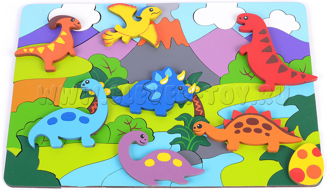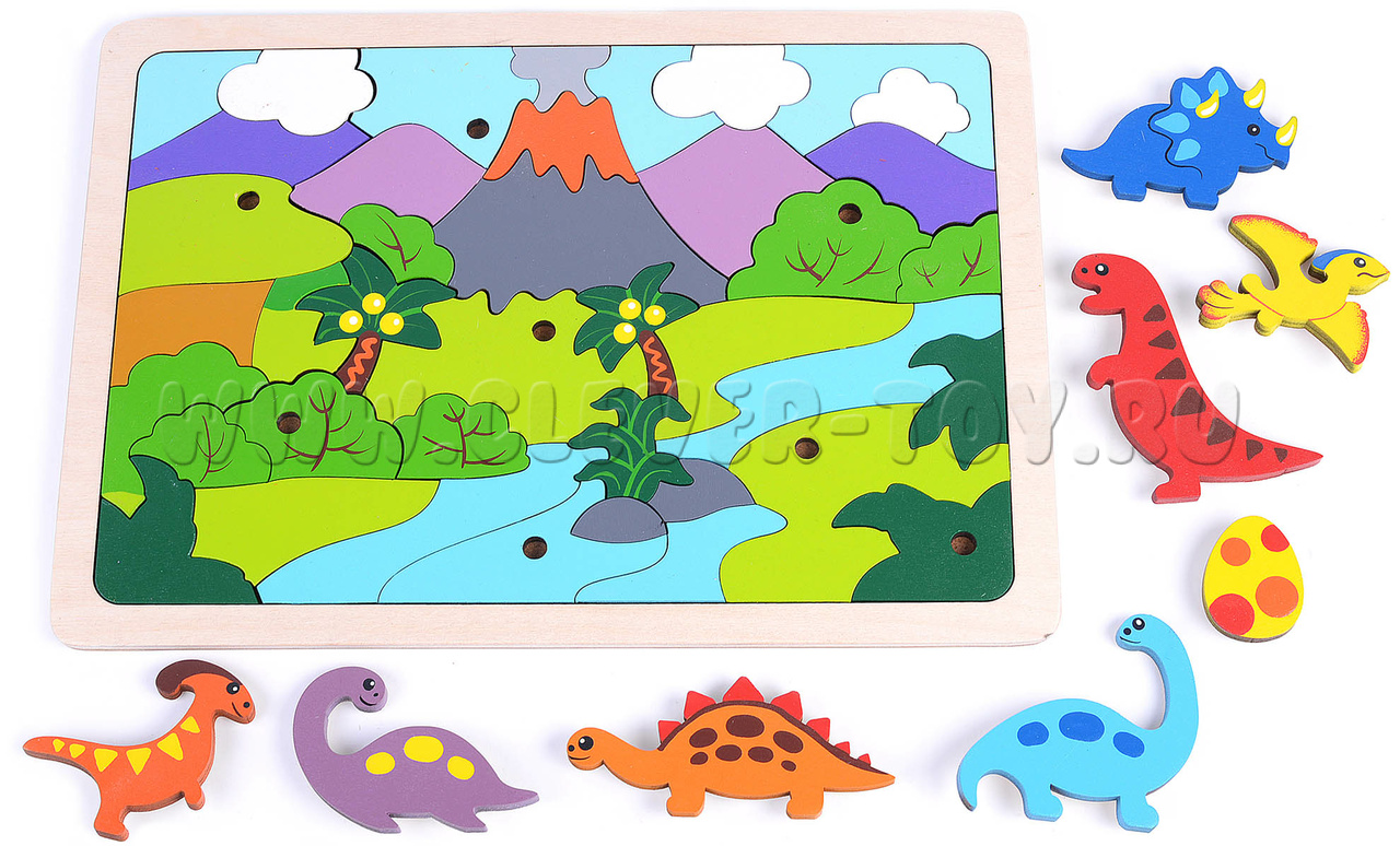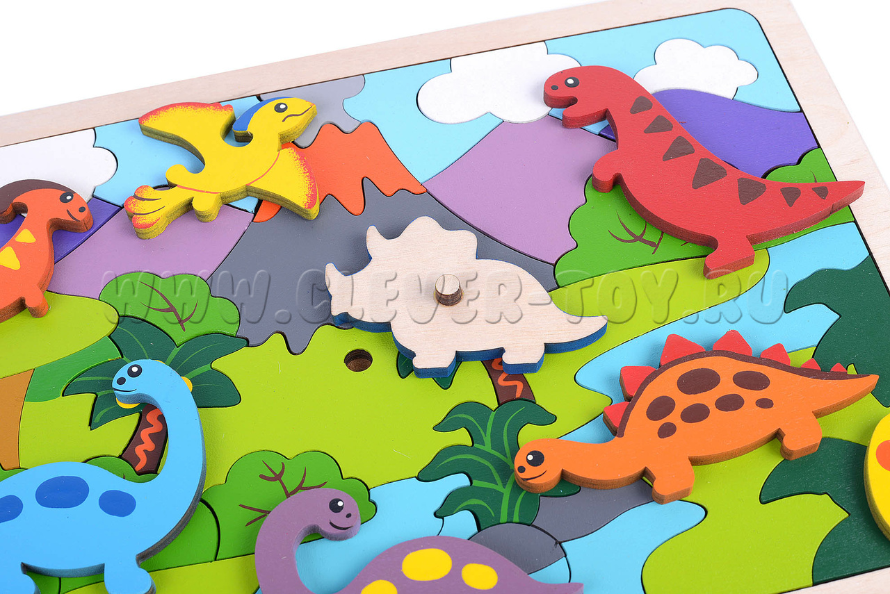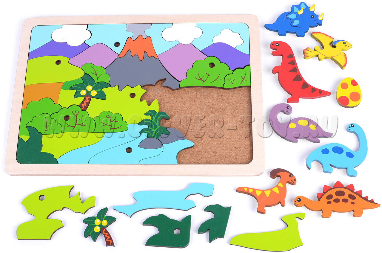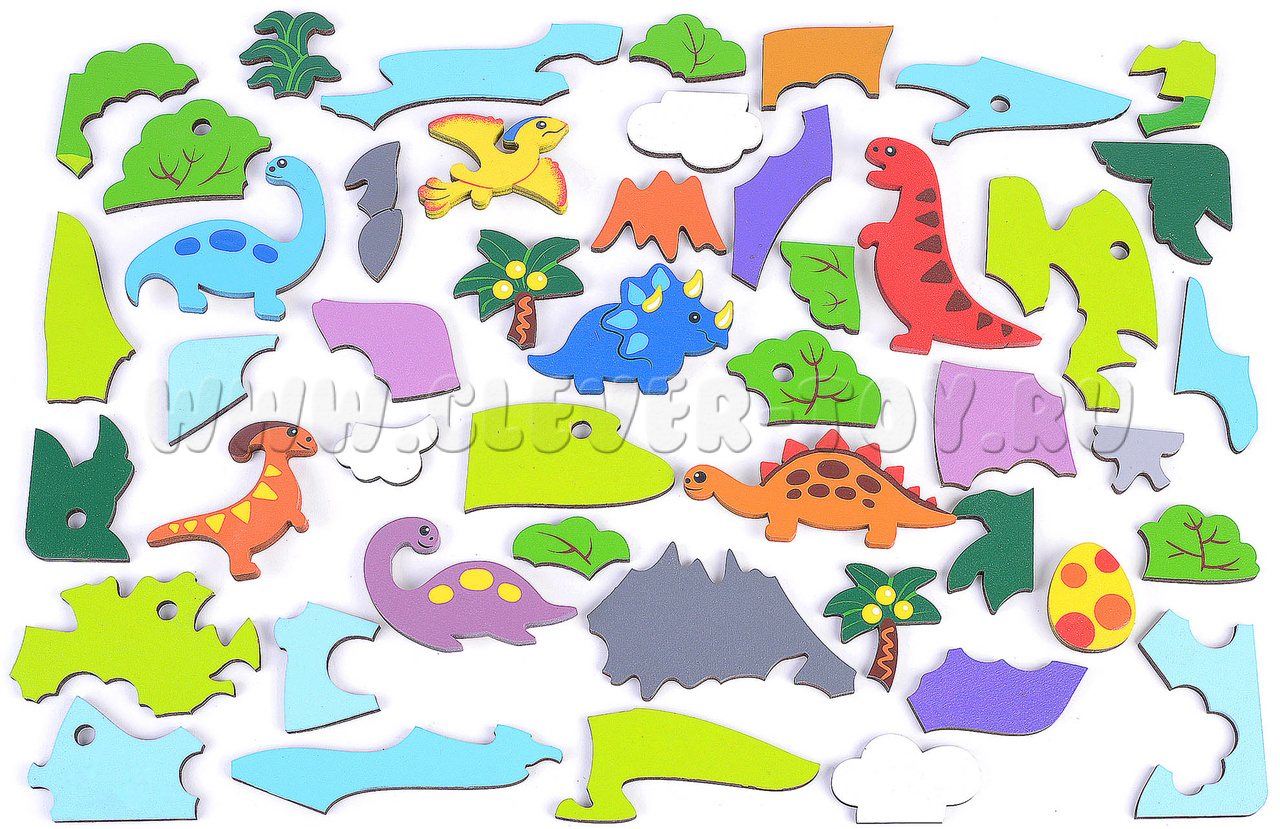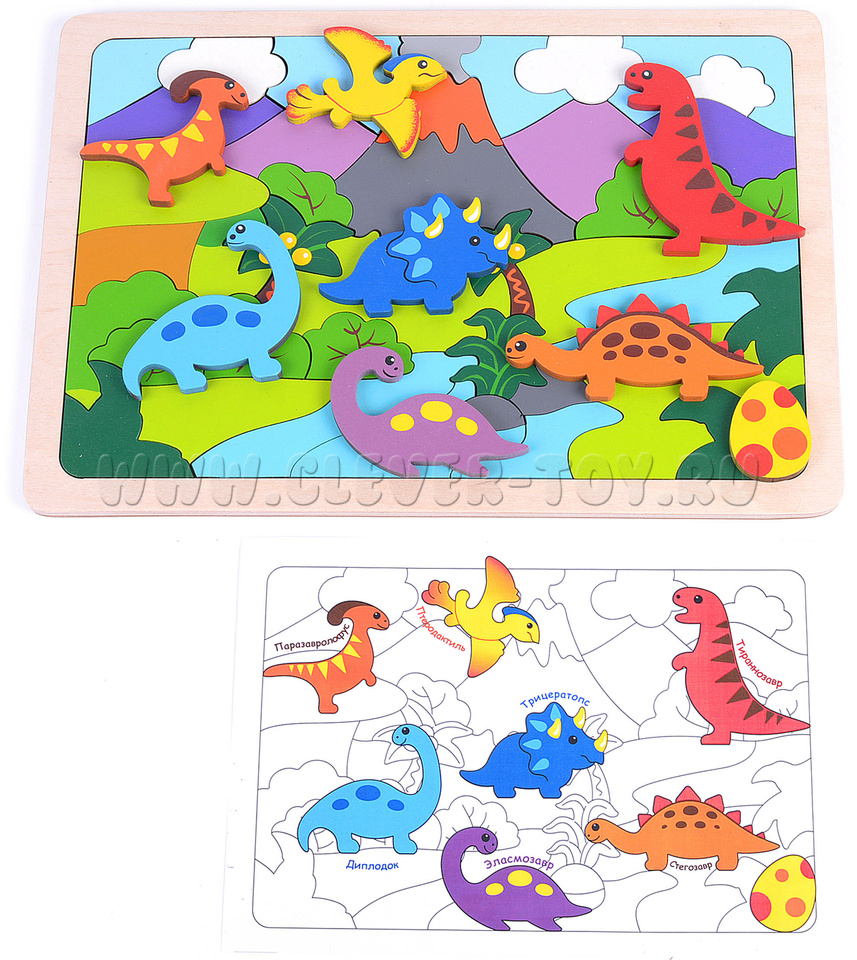 В комлекте: цветная схема сборки с названием динозавров, вкладыш со стихами-загадками про динозавров.