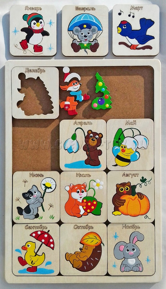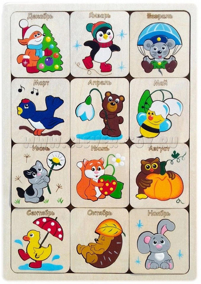 - 12 квадратных вкладышей по числу месяцев в году. На каждом вкладыше есть название месяца и картинка-пазл. Вкладыши располагаются по временам года – по 3 месяца в ряду, что соответствует числу месяцев в сезоне. Картинки с забавными животными помогут запомнить, что в декабре люди отмечают Новый год, в феврале – День защитника отечества, в апреле расцветают первые цветы – подснежники, июль приносит вкусные сладкие ягоды, в марте – начинают петь птицы, в сентябре – идут дожди, а в ноябре – первый снег и т.д