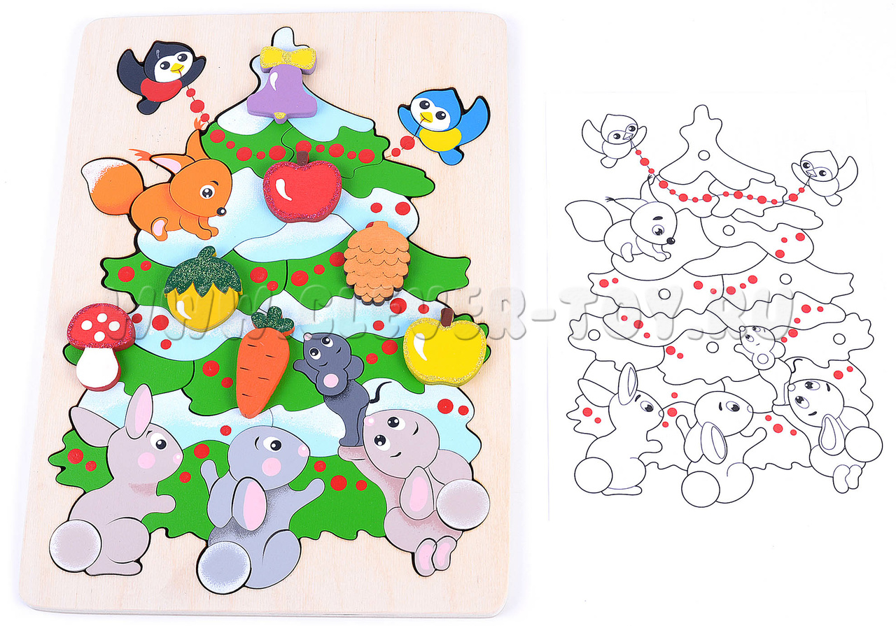 Малышу предстоит помочь лесным зверькам нарядить праздничную елочку - в этом ему помогут съемные фигурки: грибок, яблоки, шишка, морковка и колокольчик. Их ребенок может расположить в произвольном порядке, проявив фантазию.