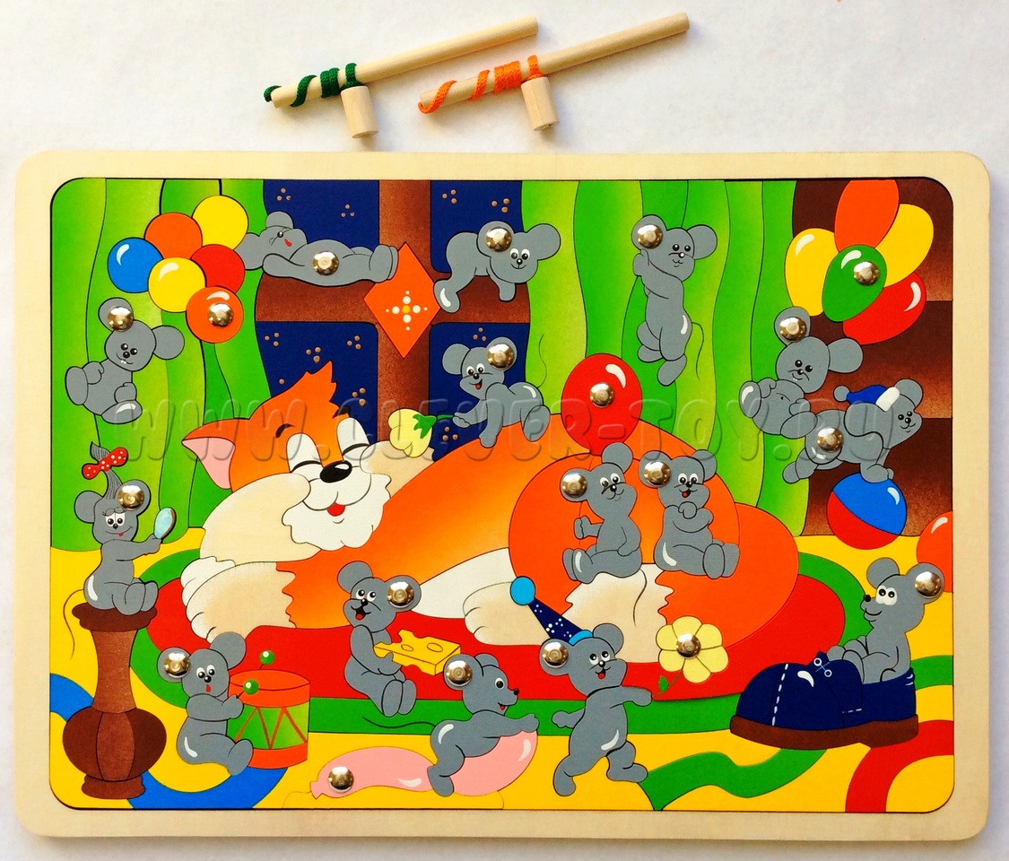 - игра-рыбалка – 2 игрока при помощи деревянных удочек и небольших магнитов, расположенных на фигурках мышек, превратят игру в увлекательное соревнование!