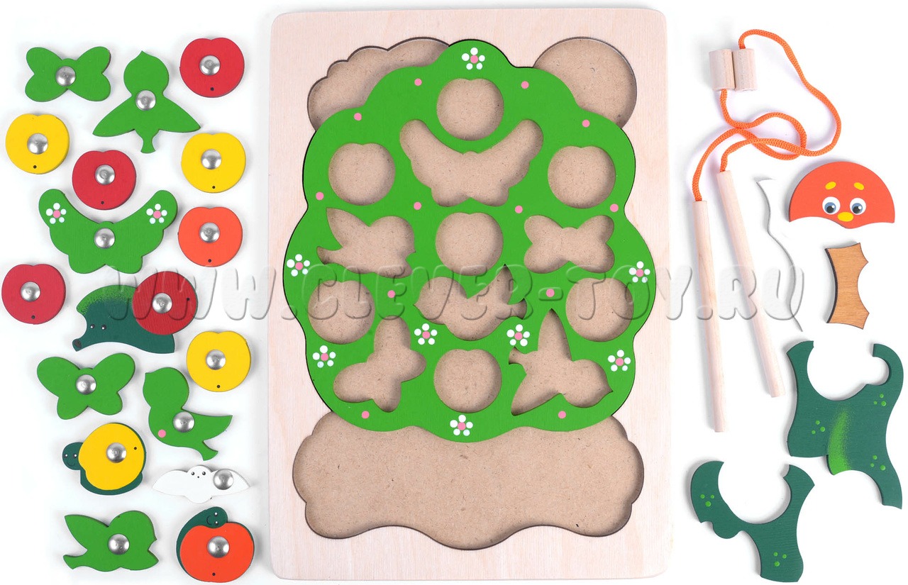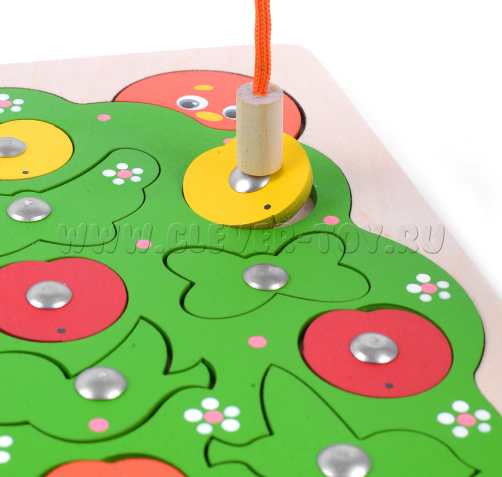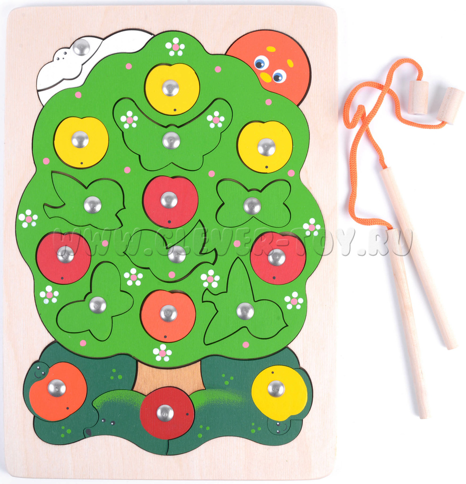 В комплекте 2 удочки для вылавливания разных элементов, спрятанных в листве яблони (яблоки, птицы, бабочки и др.). В такую игру могут играть 2 игрока.