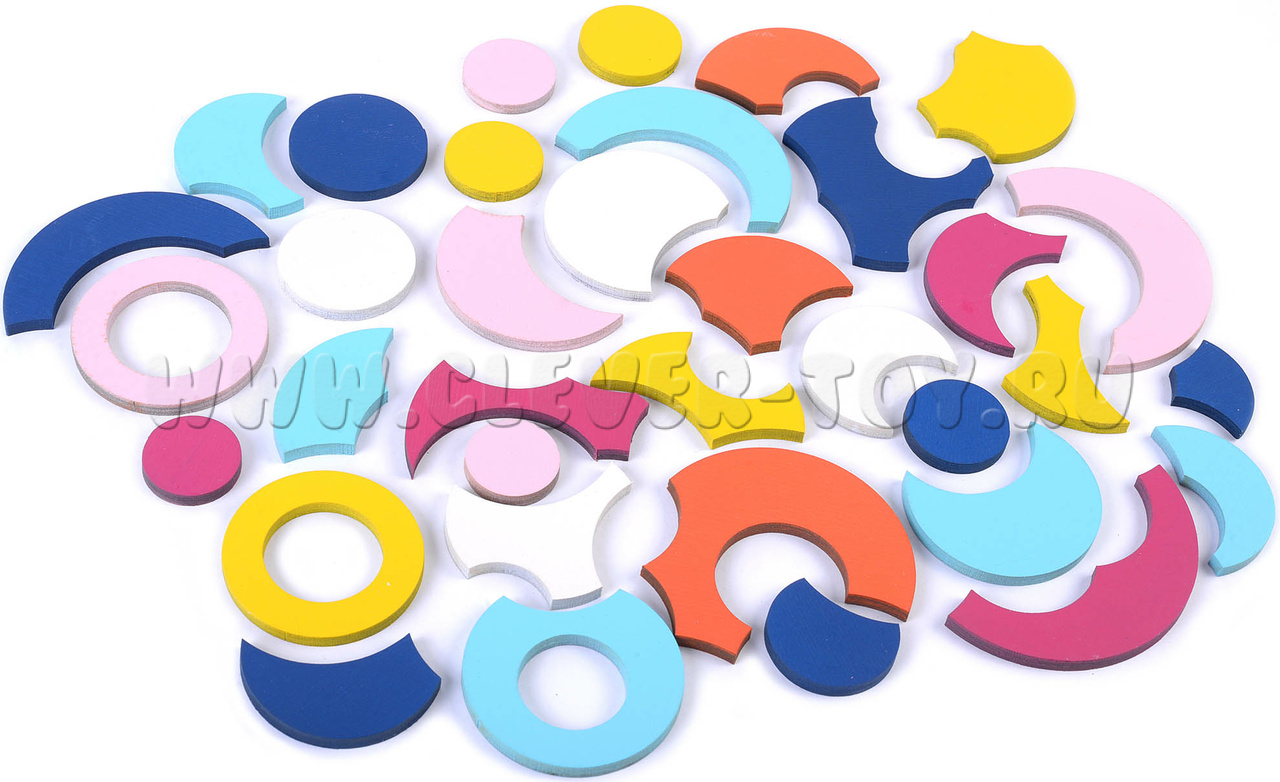 Мозаика "Найди круги" представляет собой абстрактную разрезную картинку, поле которой разбирается на 35 элементов. Все детали мозаики выполнены из дерева и окрашены безопасной краской на водной основе.