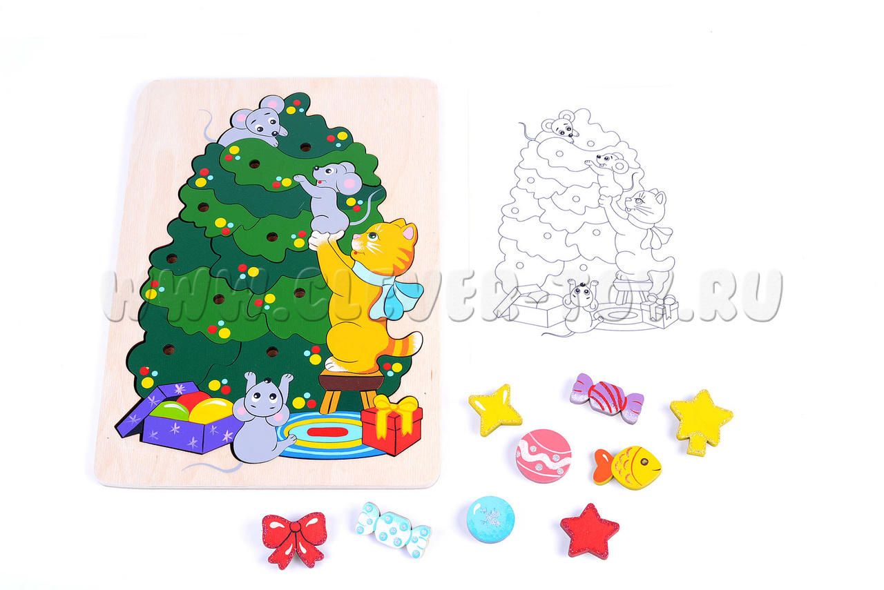 Помогите котёнку и мышатам украсить новогоднюю ёлку с двухуровневой мозаикой "Новогодние хлопоты"!