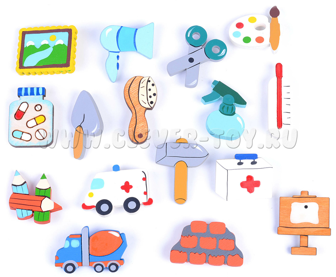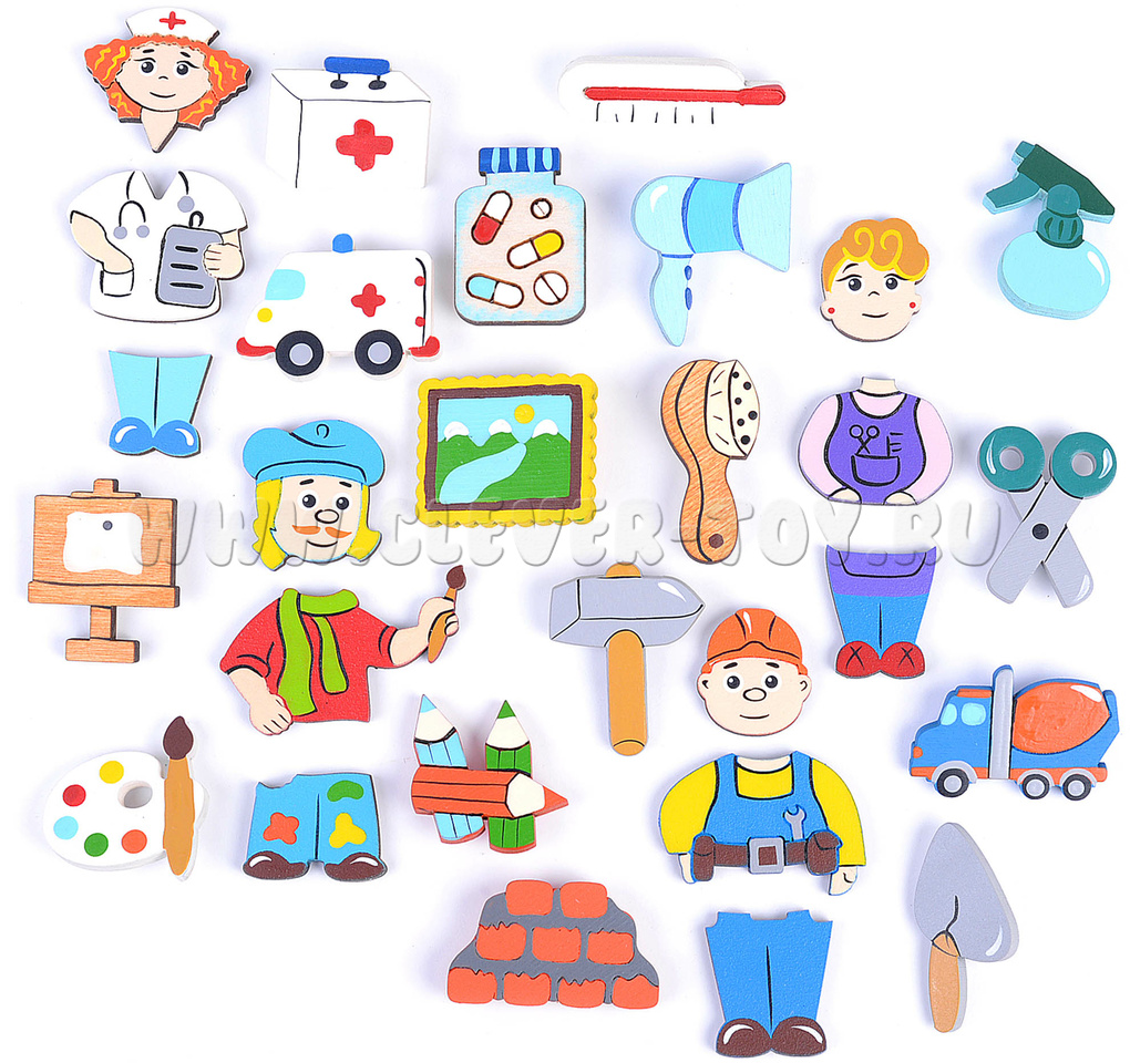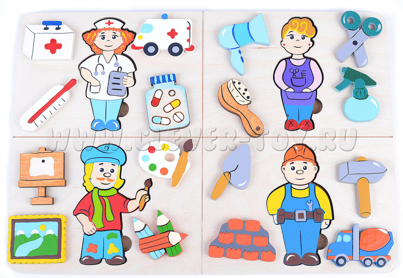 - Фигурки людей 4-х профессий (вкладываются в рамку, составные): Врач, Парикмахер, Художник, Строитель;