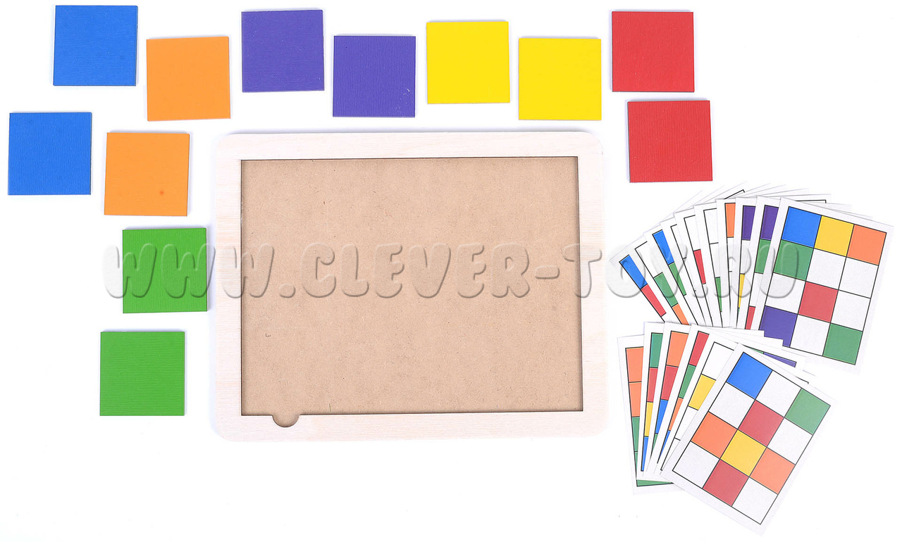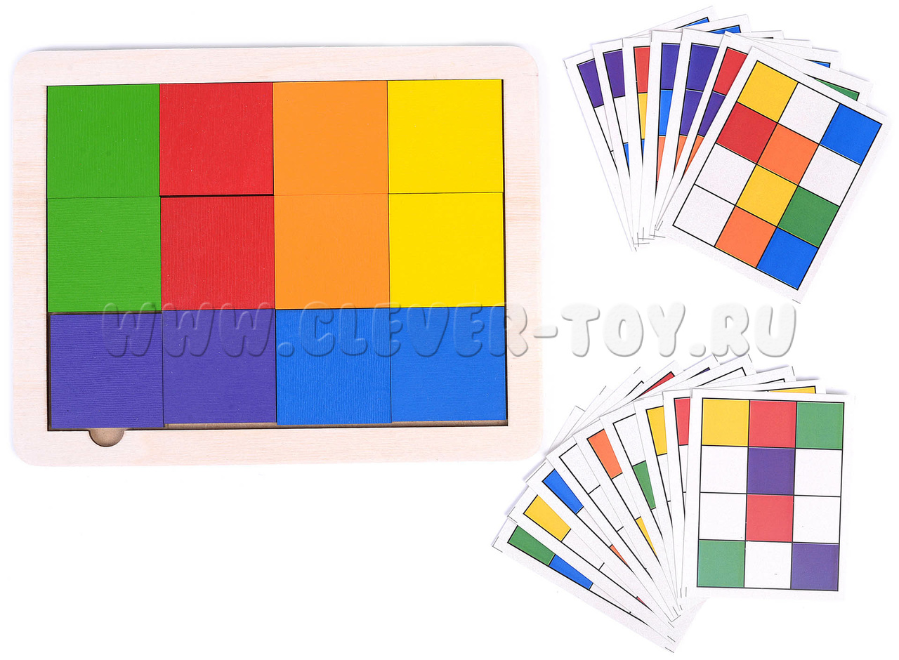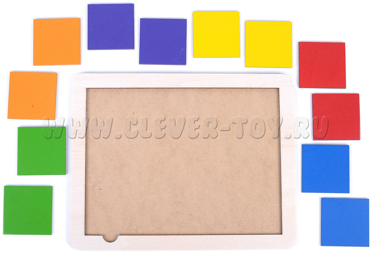 Задача ребенка: собрать по образцу рисунок в деревянной рамке из квадратов.