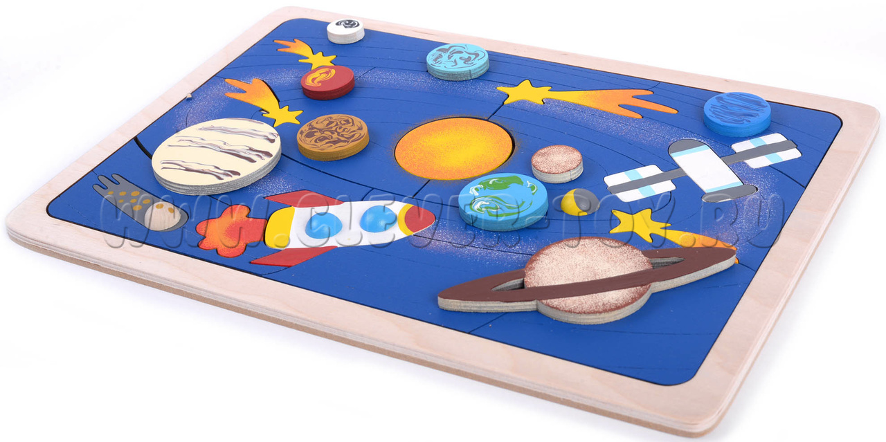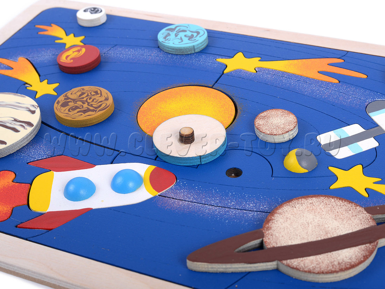 Каждая планета имеет свои уникальные особенности: Земля — голубые океаны и зелёные континенты, Сатурн — кольца, Марс — красный цвет. Ребёнок развивает мелкую моторику и координацию, вставляя и вынимая планеты-вкладыши.
