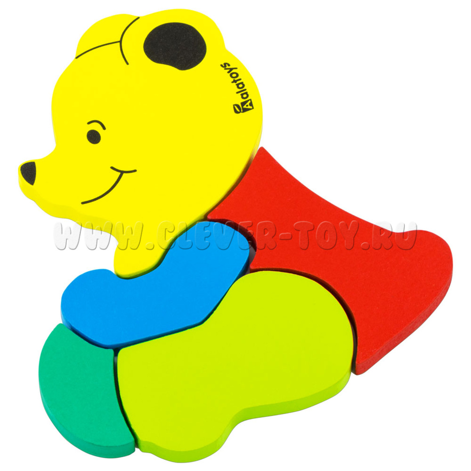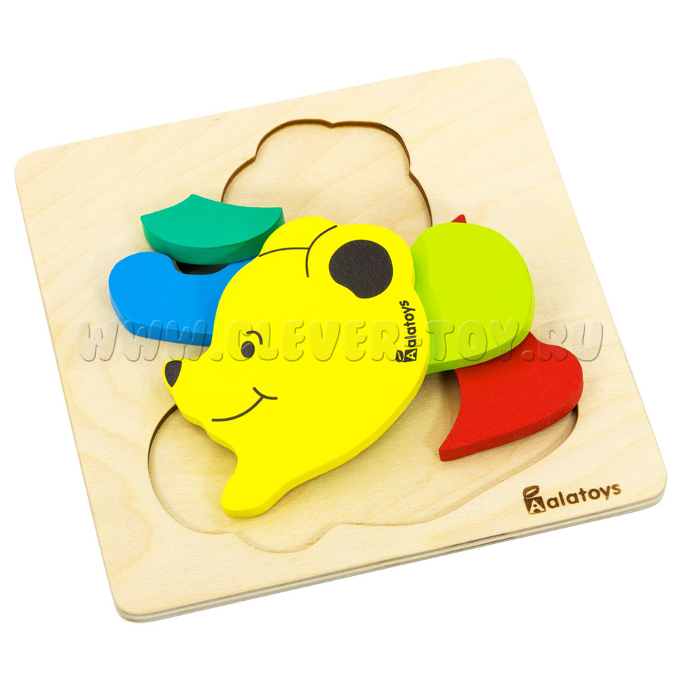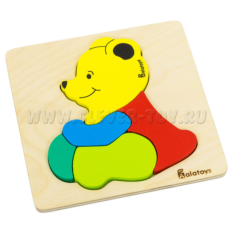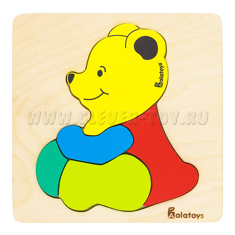 За деталями легко ухаживать: просто протирайте детали чистой влажной тканью. Пазл «Медведь» представляет собой деревянную основу с углублениями для размещения деталей уточки. Только правильно подобрав детали по форме и размеру, у ребёнка получится сложить правильные пазлы. Не забывайте хвалить малыша при каждом верном действии, ведь это развивает в нём стремление к успешности. Пазл «Медведь» состоит из: -деревянной рамки-вкладыша, - 5-ти разноцветных деталей, из которых складывается фигурка медведя (голова,туловище, лапы), окрашенных в жёлтый, синий, тёмно- и светло зелёный, красный цвета.
