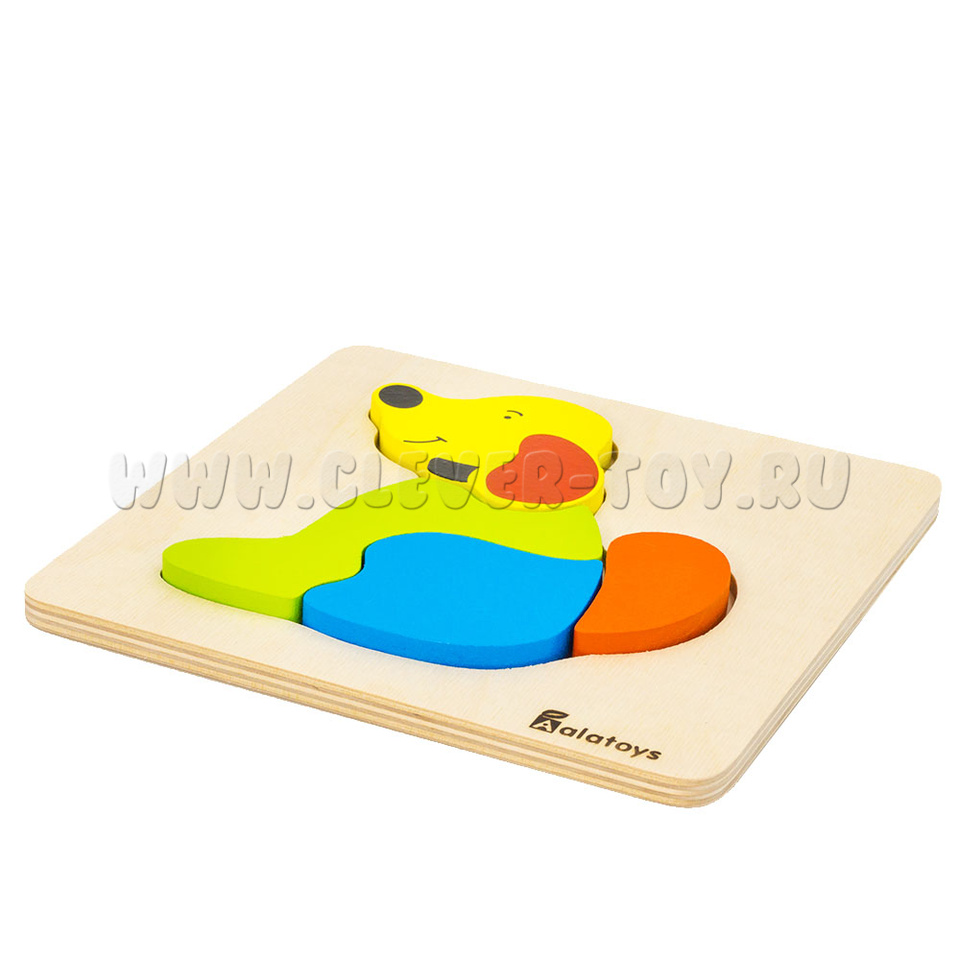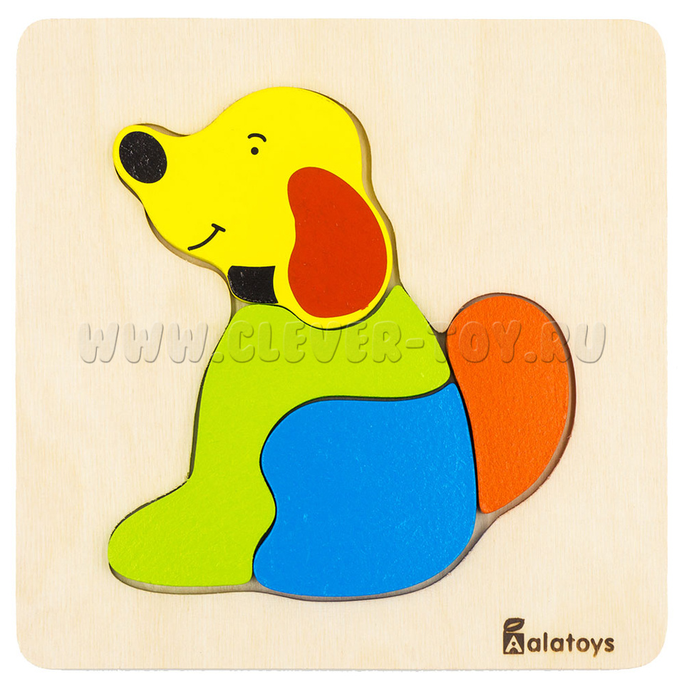 Пазл «Собачка» представляет собой деревянную основу с углублениями для размещения деталей собачки. Только правильно подобрав детали по форме и размеру, у ребёнка получится сложить правильные пазлы. Не забывайте хвалить малыша при каждом верном действии.