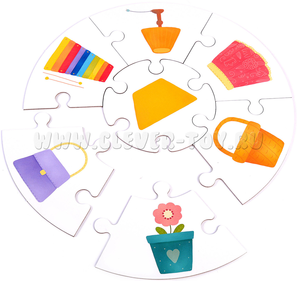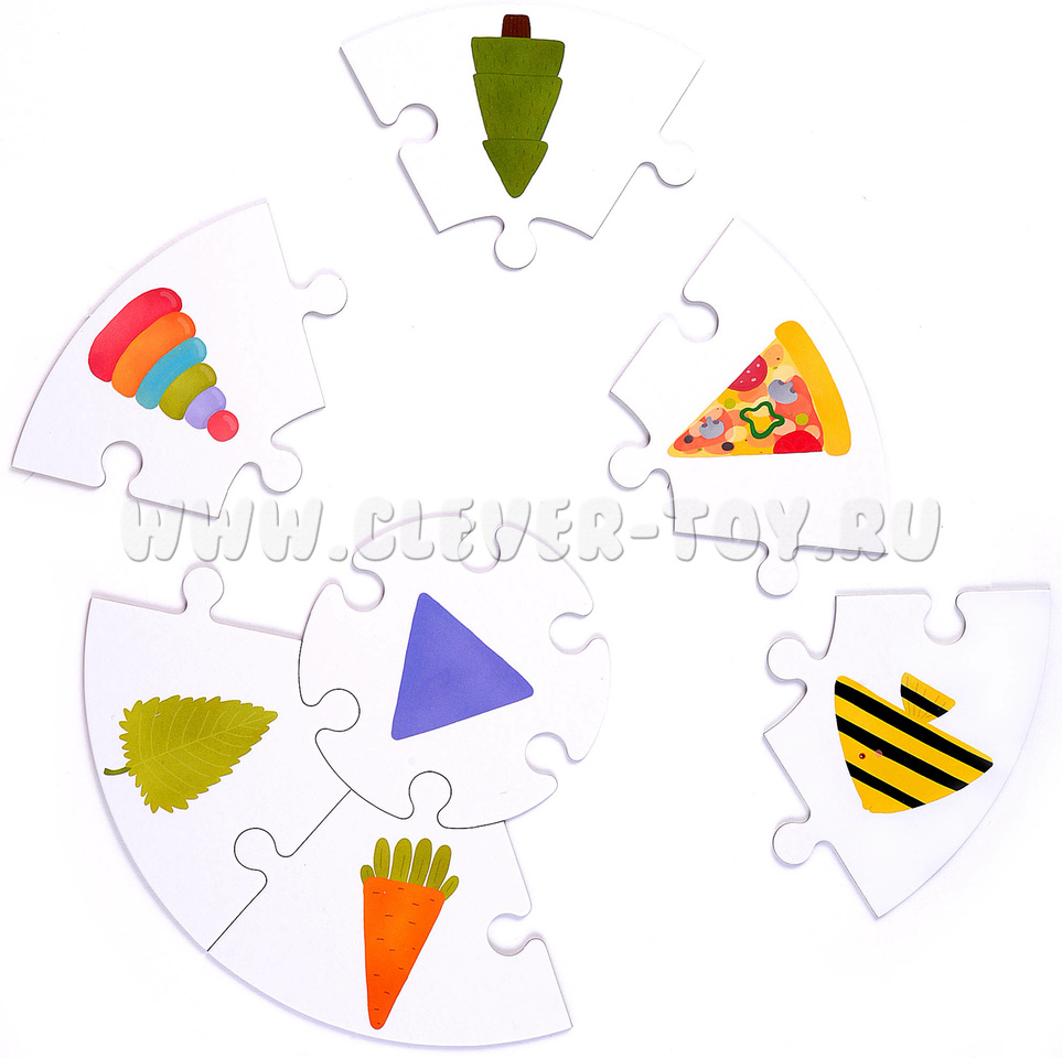 - Игра на стороне с белым фоном. Разложите на столе круглые центральные части головоломок, остальные элементы перемешайте. Предложите малышу подобрать к каждой серединке 6 подходящих элементов и сложить пазл. Для проверки можно использовать обратную сторону пазла - если все кусочки собраны верно, на оборотной стороне будут нарисованы одинаковые предметы;