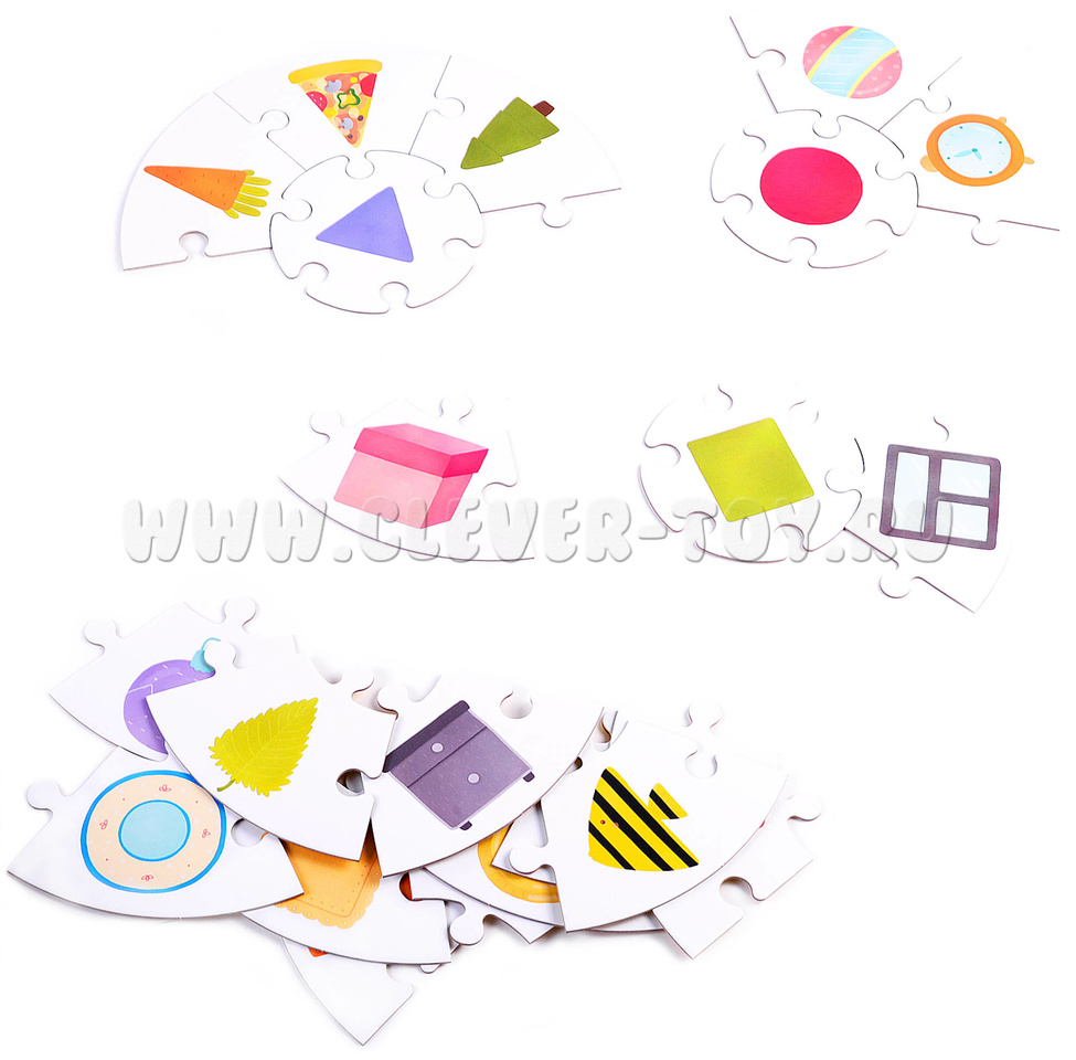 - Игра на стороне с белым фоном в команде от 2 до 6 человек. Раздайте игрокам центральные части пазлов, перевернутые белой стороной вверх. Перемешайте остальные элементы и случайным образом выберите один из них, покажите играющим. Тот, у кого такая же фигура изображена на серединке, забирает элемент себе. Побеждает игрок, быстрее всех собравший полный круг.