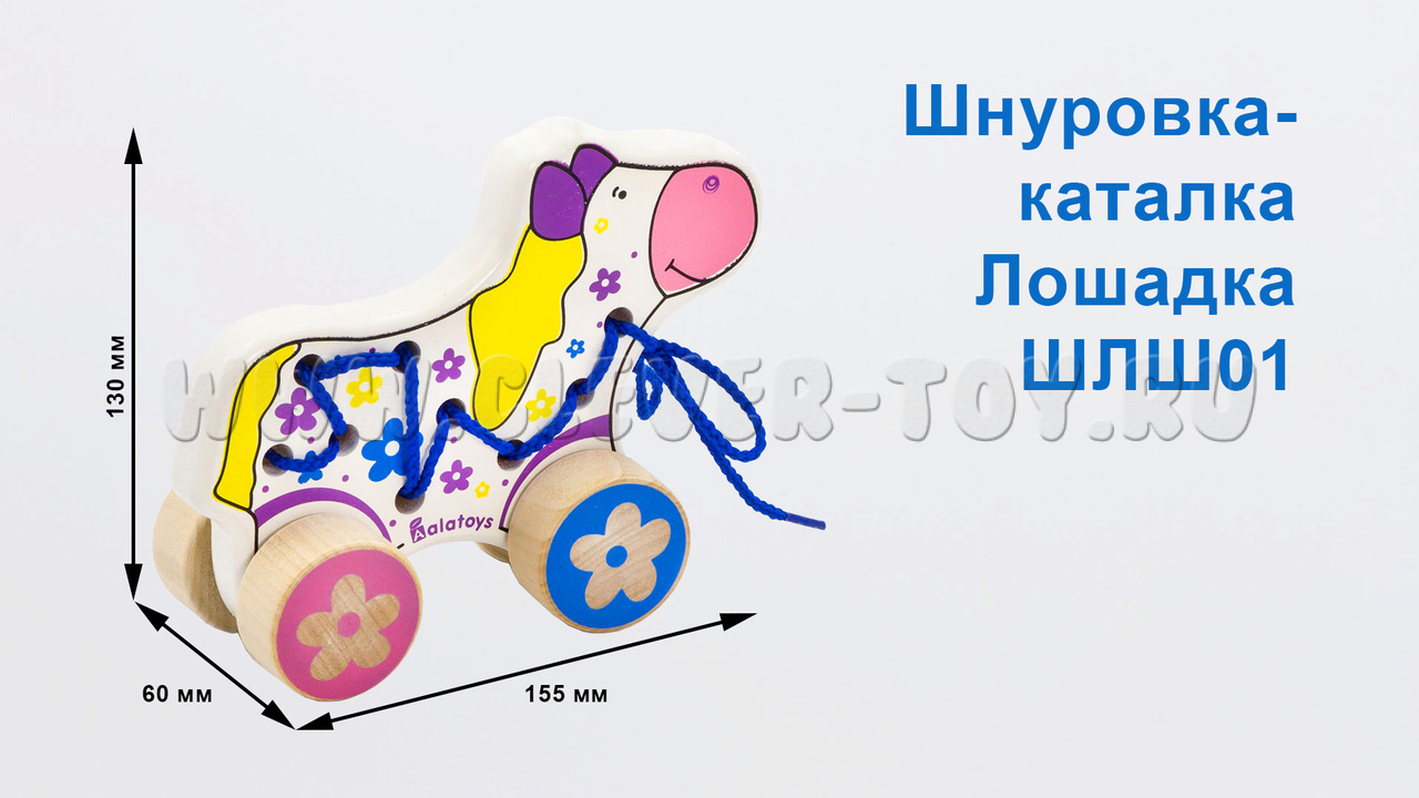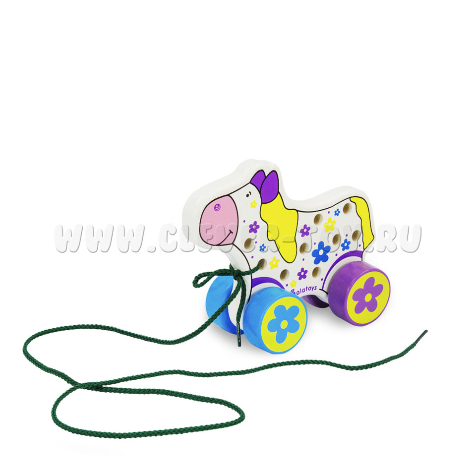Детская игрушка –каталка в форме милой лошадки отлично подойдет для девочек. "Лошадь" многофункциональна игрушка потому, что содержит вдобавок шнуровку для развития пальчиков. Огромную пользую она принесет детям, у которых трудности в речевом развитии, потому, что развивая моторику рук и пальцев, можно параллельно развивать участок коры головного мозга, отвечающий за формирование речи. Если правильно протянуть шнуровку между дырками, то можно сделать из лошадки – каталку. Таким образом, деревянная лошадка отличная развивающая игрушка для малышей.