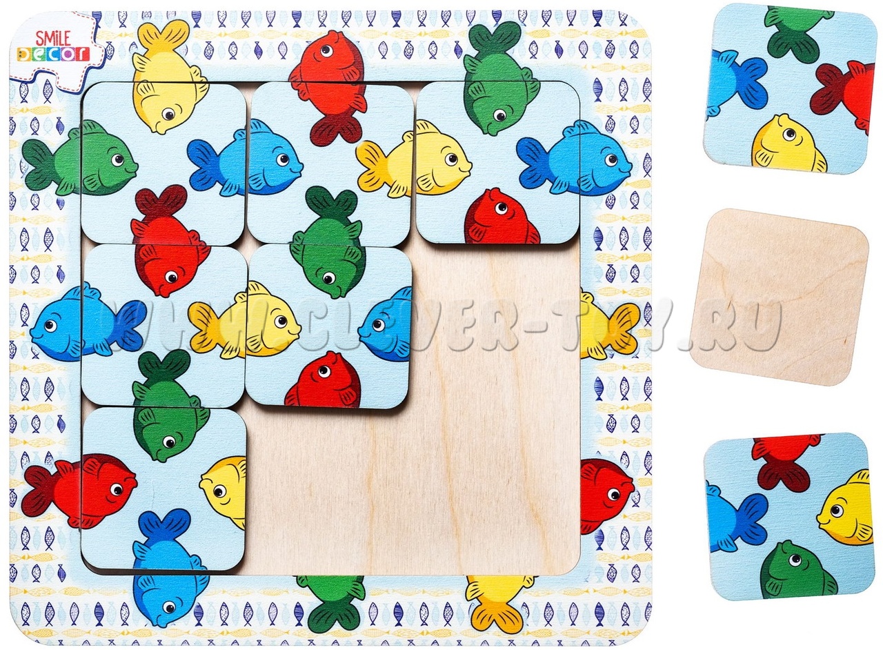 2. Игра "Собери рыбок". Достаньте несколько элементов головоломки из рамки-основания. Предложите ребенку вставить квадраты обратно в рамку так, чтобы половинки рыбок (голова и хвост) соответствовали друг другу по цвету. Если ребенок легко справляется с заданием, то извлеките все элементы и попросите собрать рыбок в аквариуме.