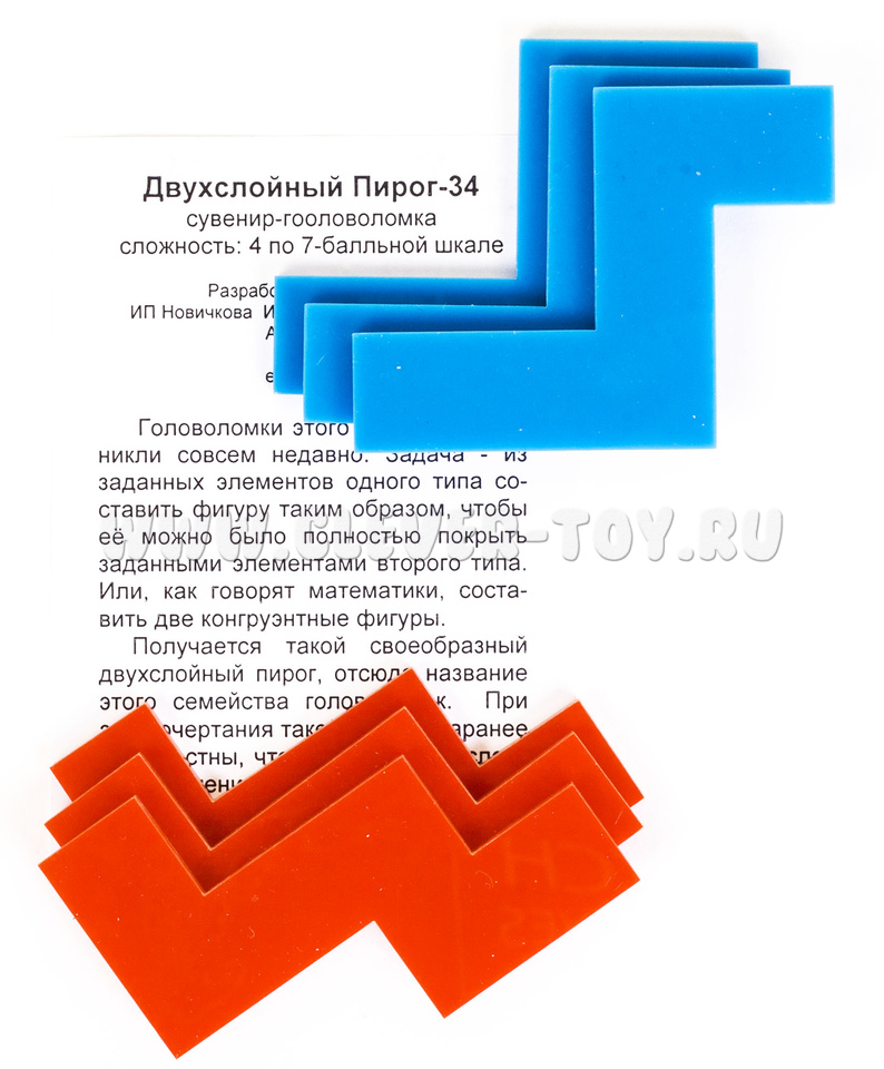 Задача: используя 3 однотипных элемента, сложите фигуру, которую можно полностью покрыть тремя элементами другого типа. Получается своеобразный двухслойный пирог, отсюда название этого семейства головоломок.