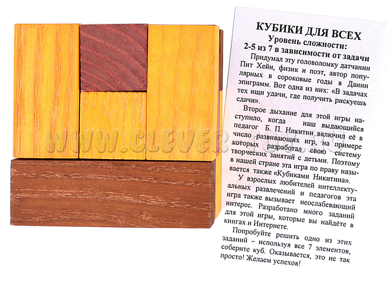 Основная задача головоломки "Кубики для всех" - умение собрать из всех 7 деталей куб.