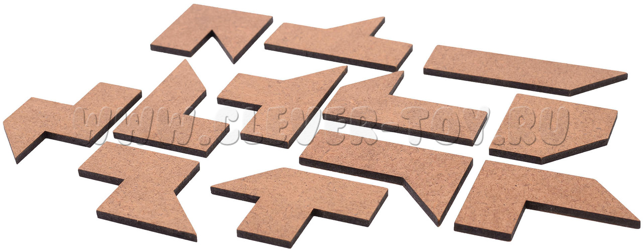 Для тех, кто только знакомится с головоломкой, есть задания попроще: нужно собрать фигуры по заданным силуэтам, используя все 12 элементов набора. Попробуйте последовательно сложить прямоугольник размером 3 х 14 или 6 х 7, а затем - более интересные фигуры: "Репку", "Письмо", "Кулон‑сердечко" и другие. Изображения всех этих силуэтов вы найдёте на обратной стороне этикетки, так что всегда будет понятно, к чему стремиться.
