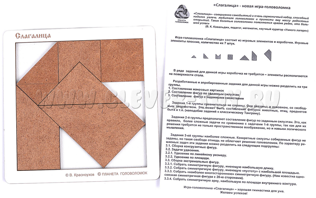 Слагалица - совершенно самобытный и очень гармоничный набор, способный надолго увлечь любителя головоломок и принести ему массу радостных открытий. Задачи - Построение фигур по заданным силуэтам.