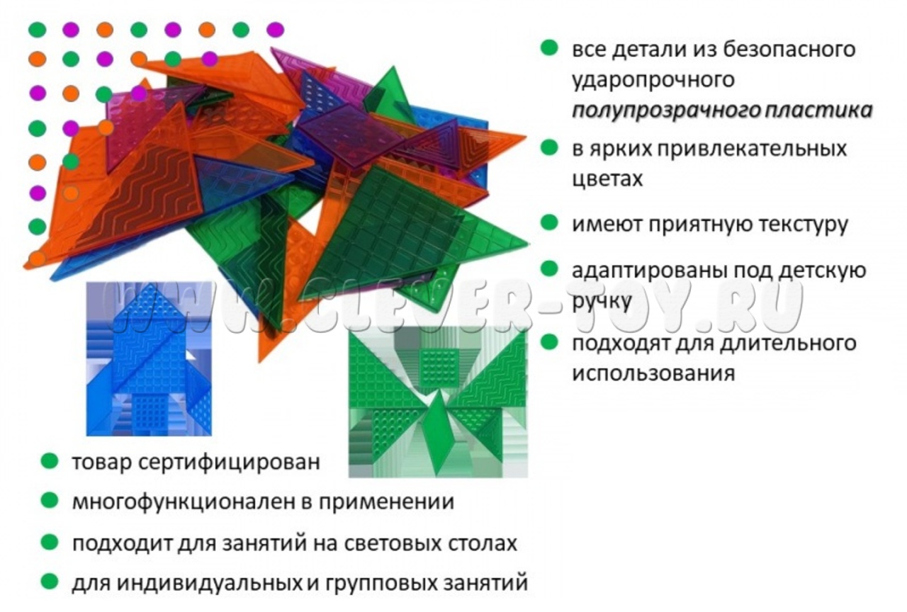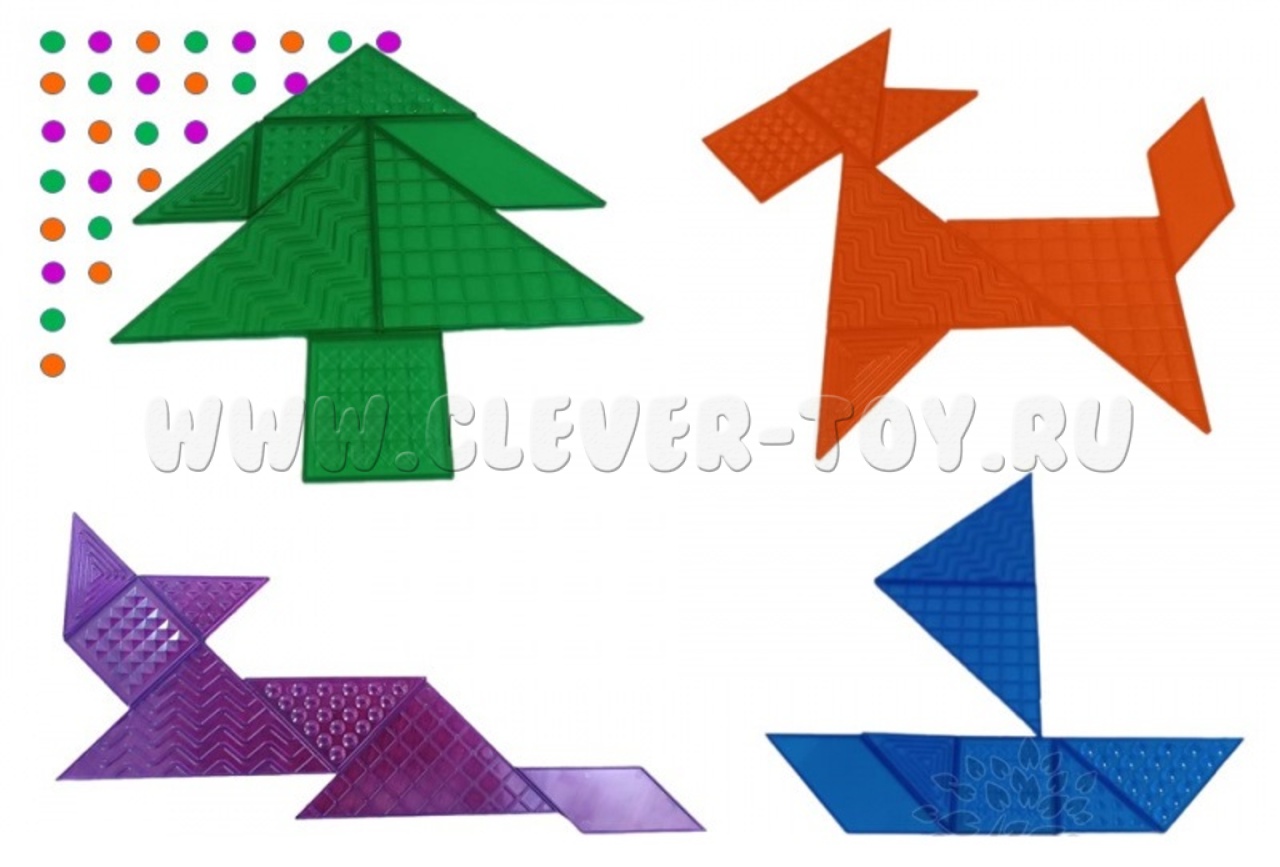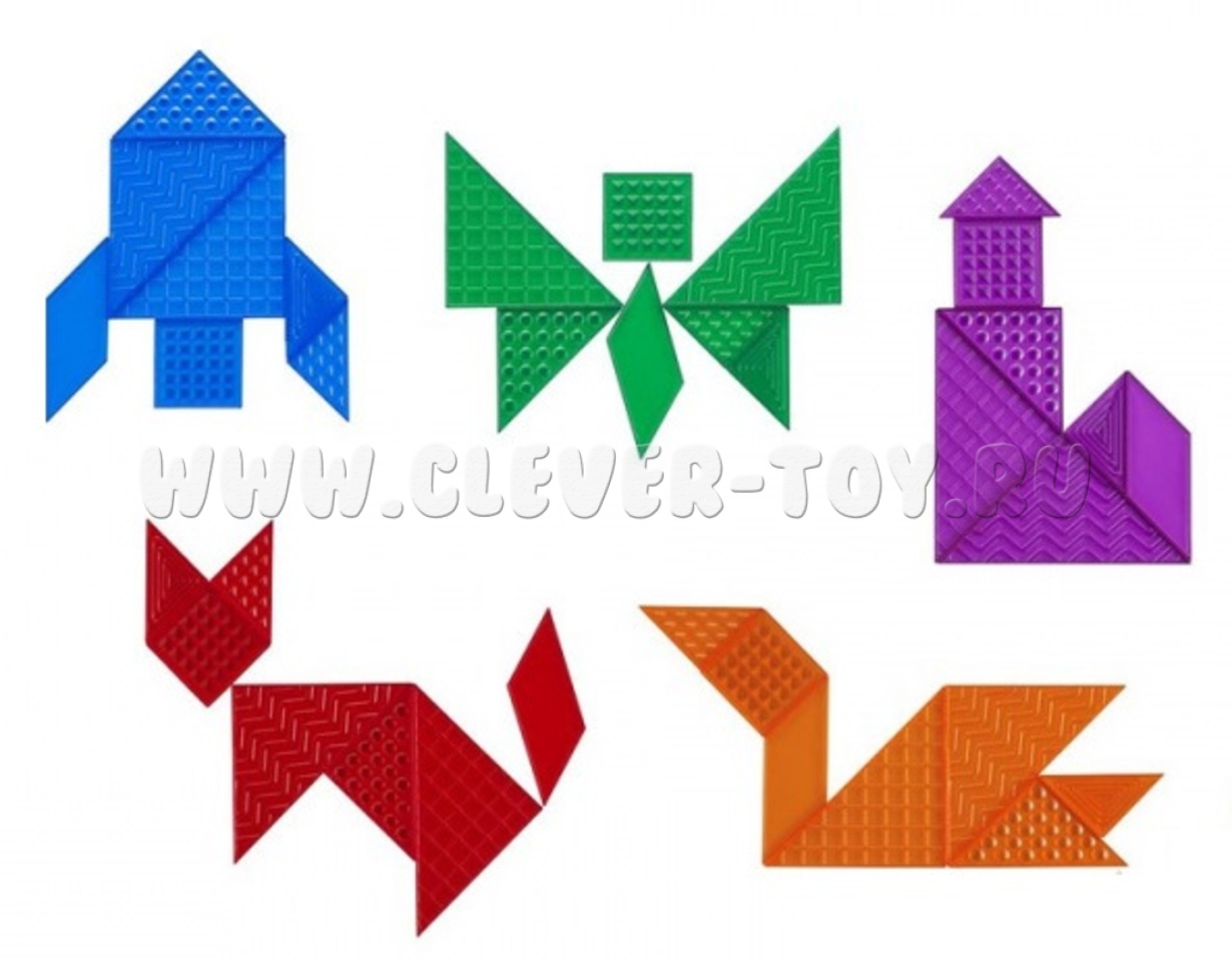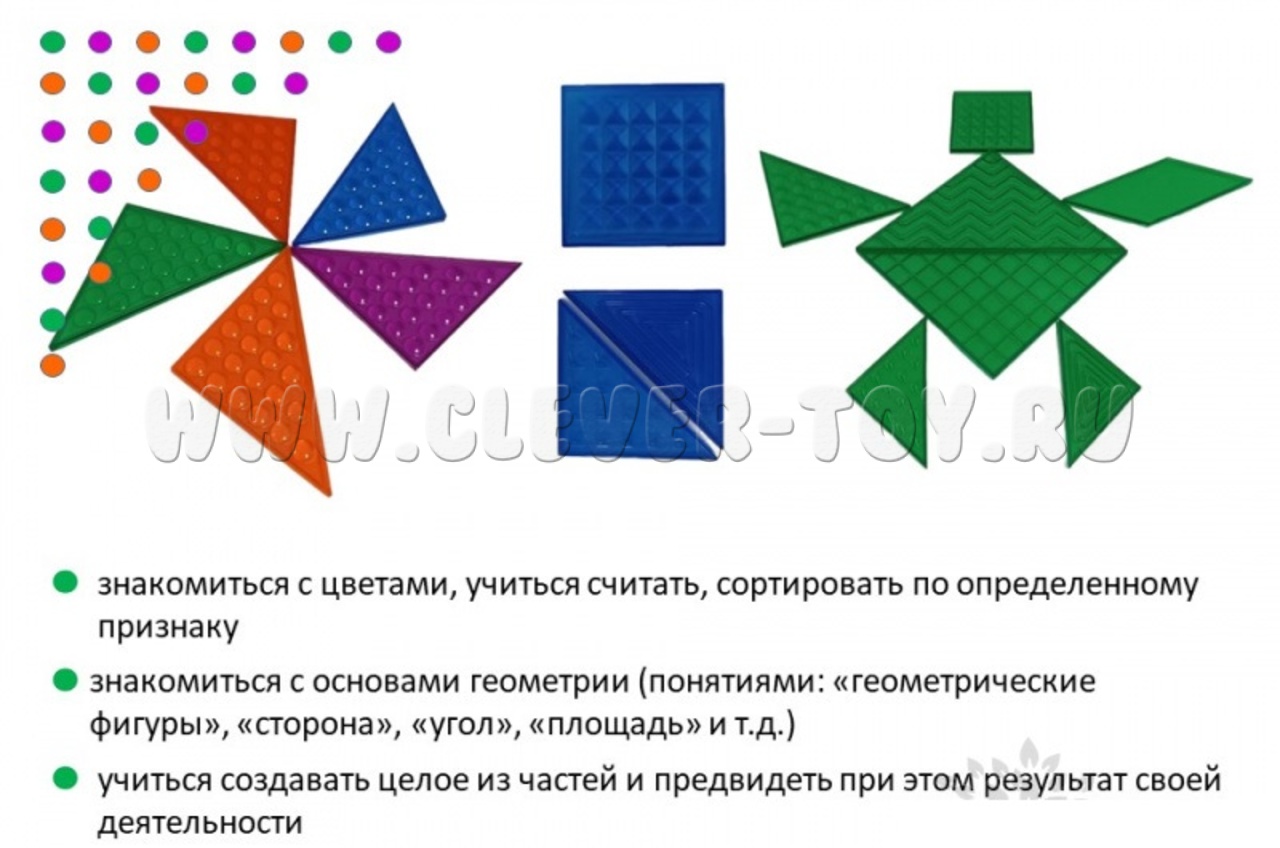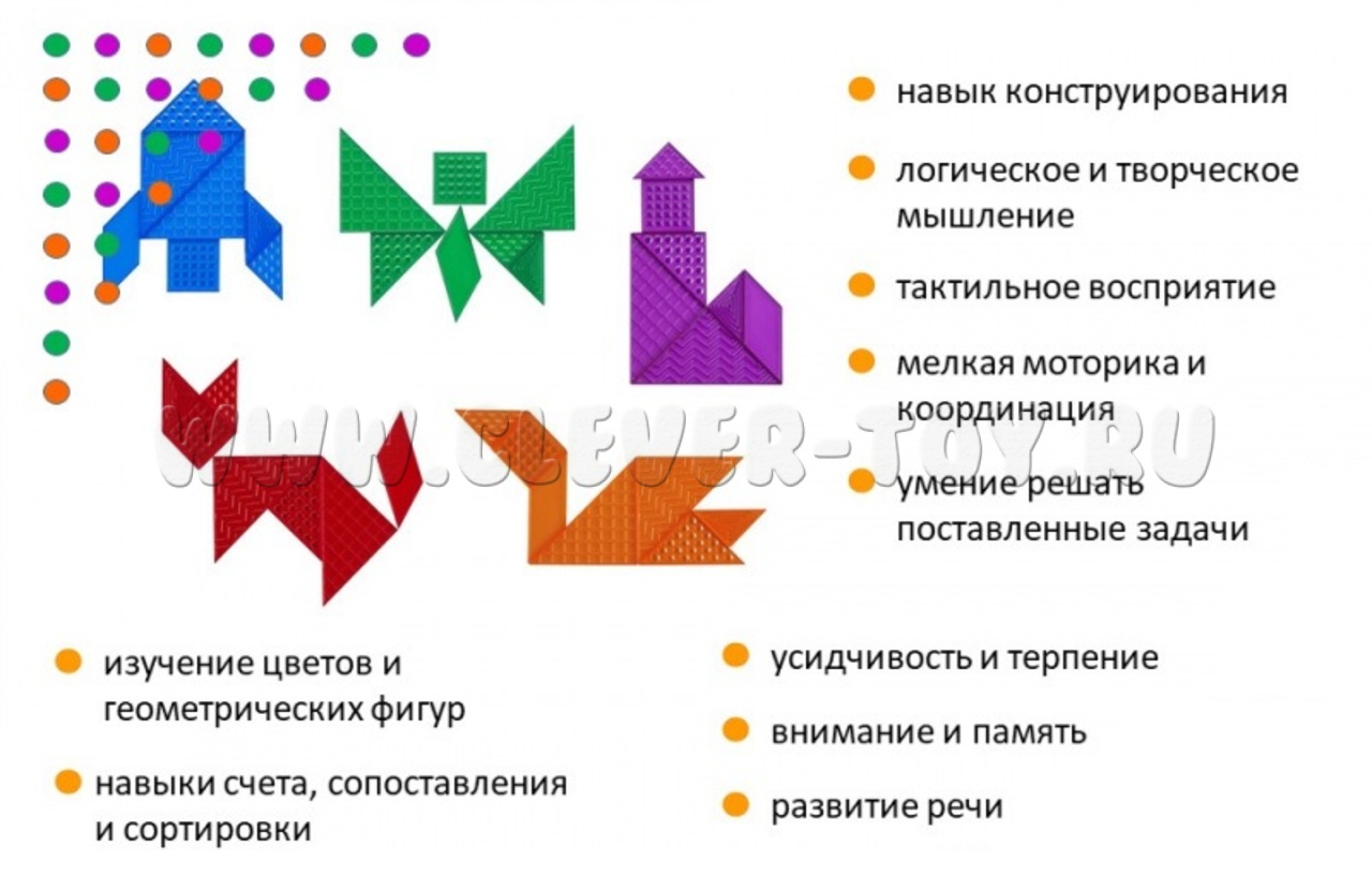 Предназначен для развития тактильного восприятия, воображения, логического мышления, усидчивости и внимания, помогает создавать целое из частей и предвидеть при этом результат своей деятельности, знакомит с основами геометрии (понятие площадь, фигура, угол, сторона и т.д.).